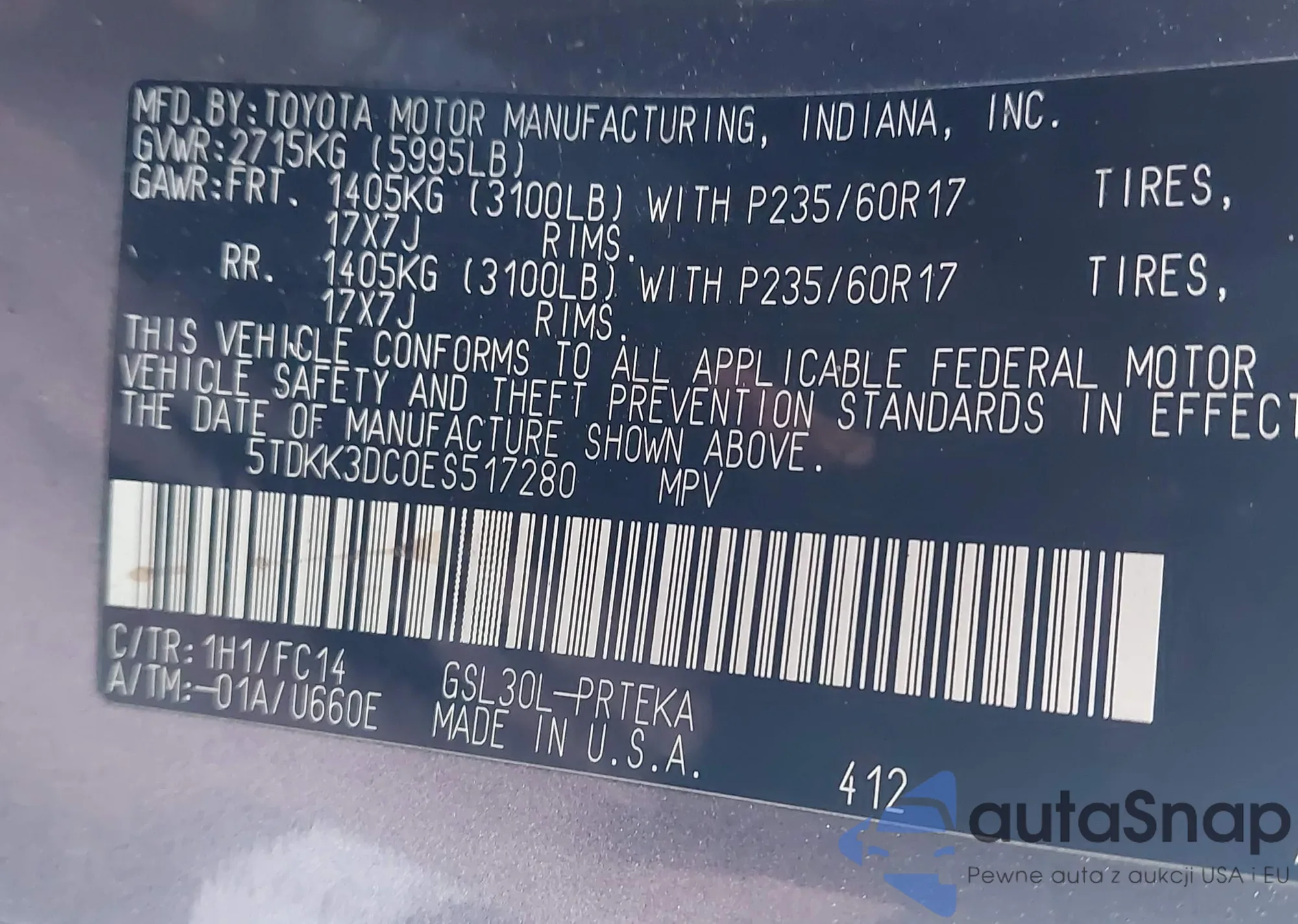 LOT: 43682774 VIN: 5TDKK3DC0ES517280