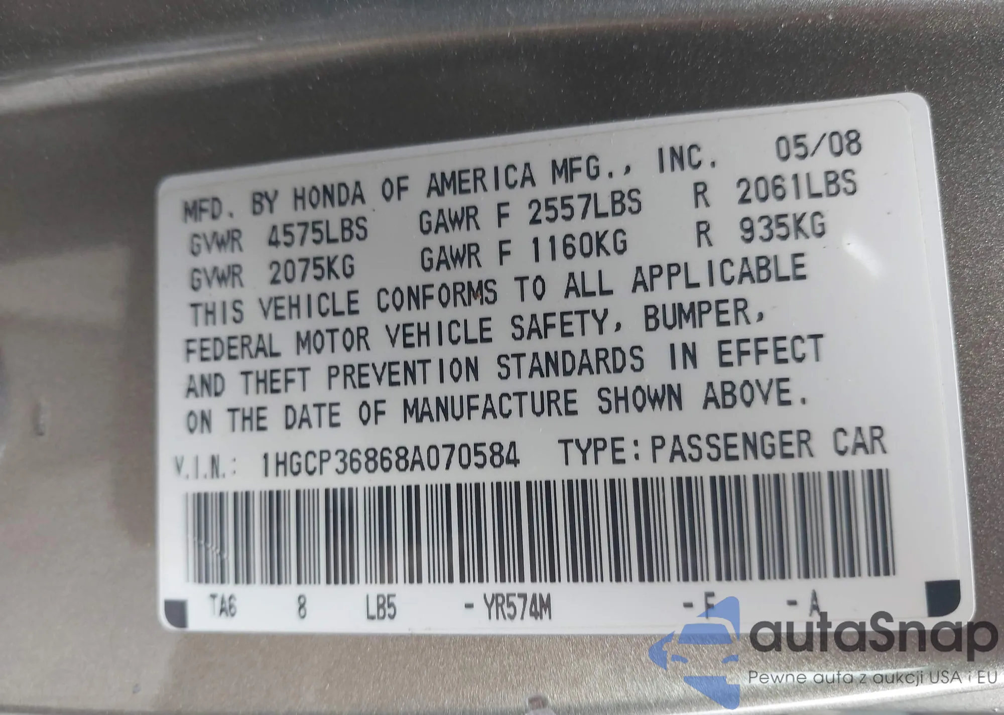 LOT: 43942517 VIN: 1HGFA16887L026348