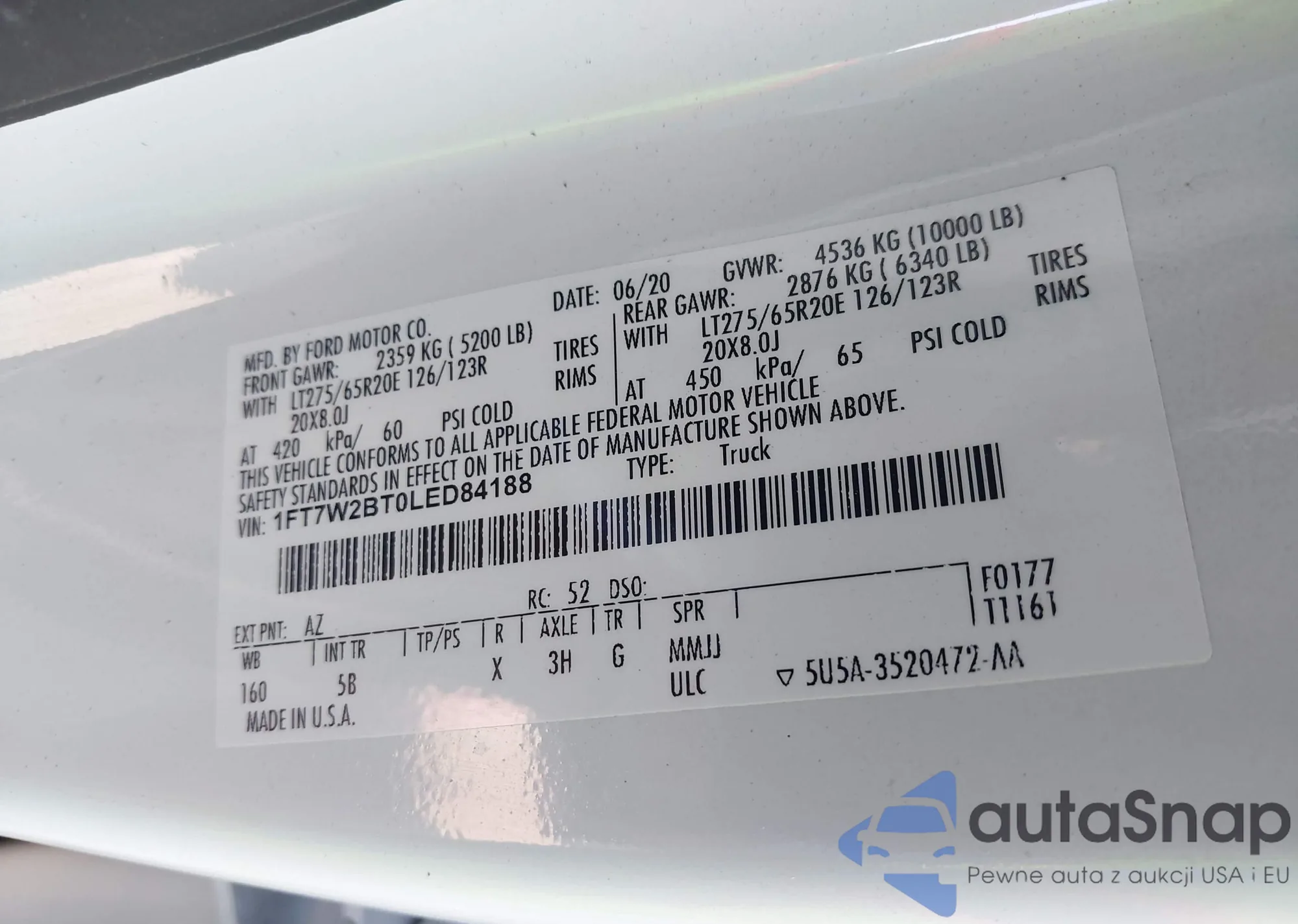 LOT: 43650085 VIN: 1FT7W2BT0LED84188