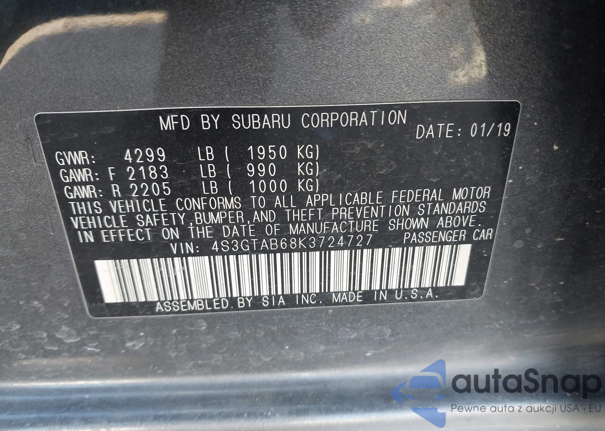 • VIN 4S3GTAB68K3724727