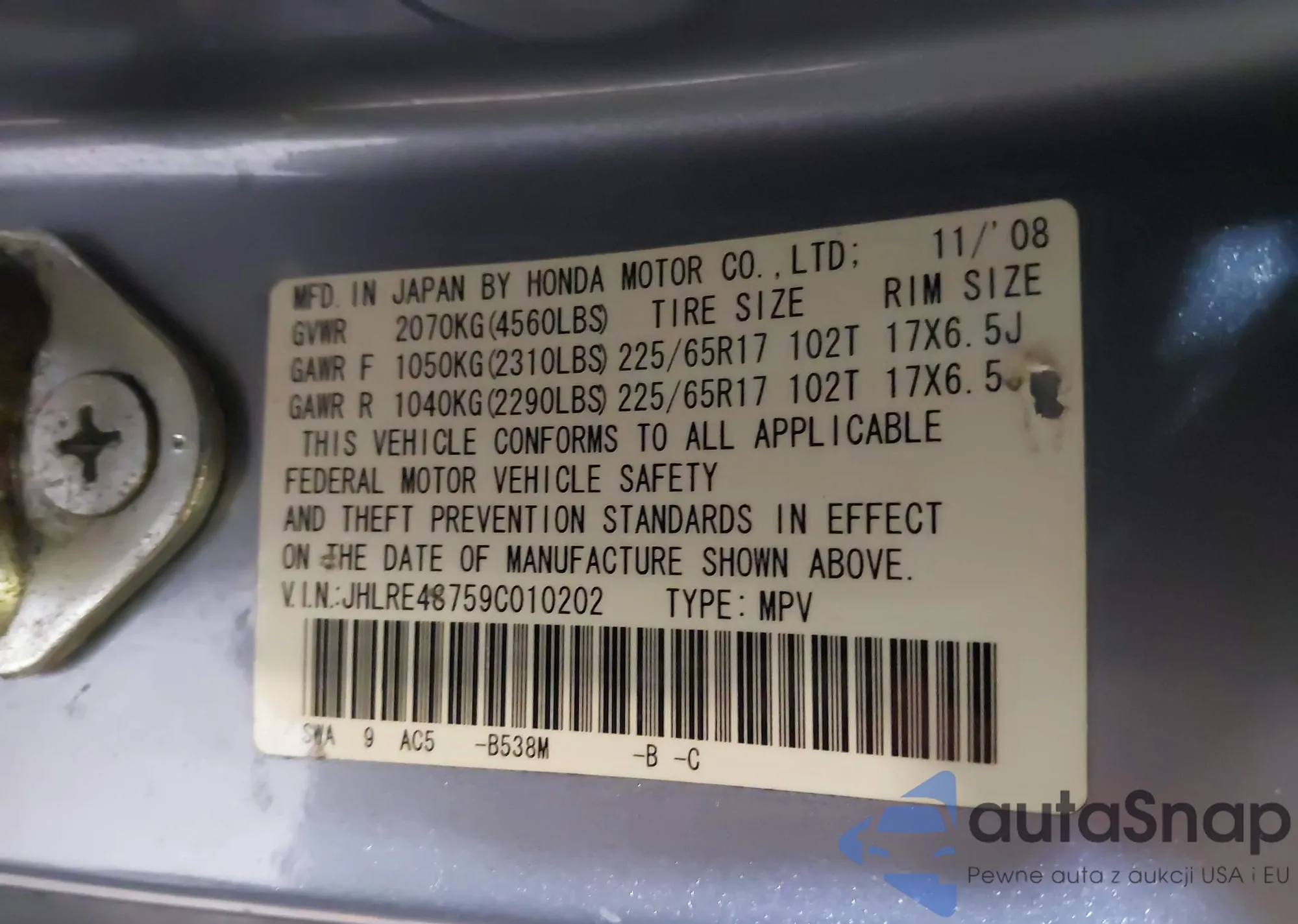 • VIN 2HKRW5H30JH420315