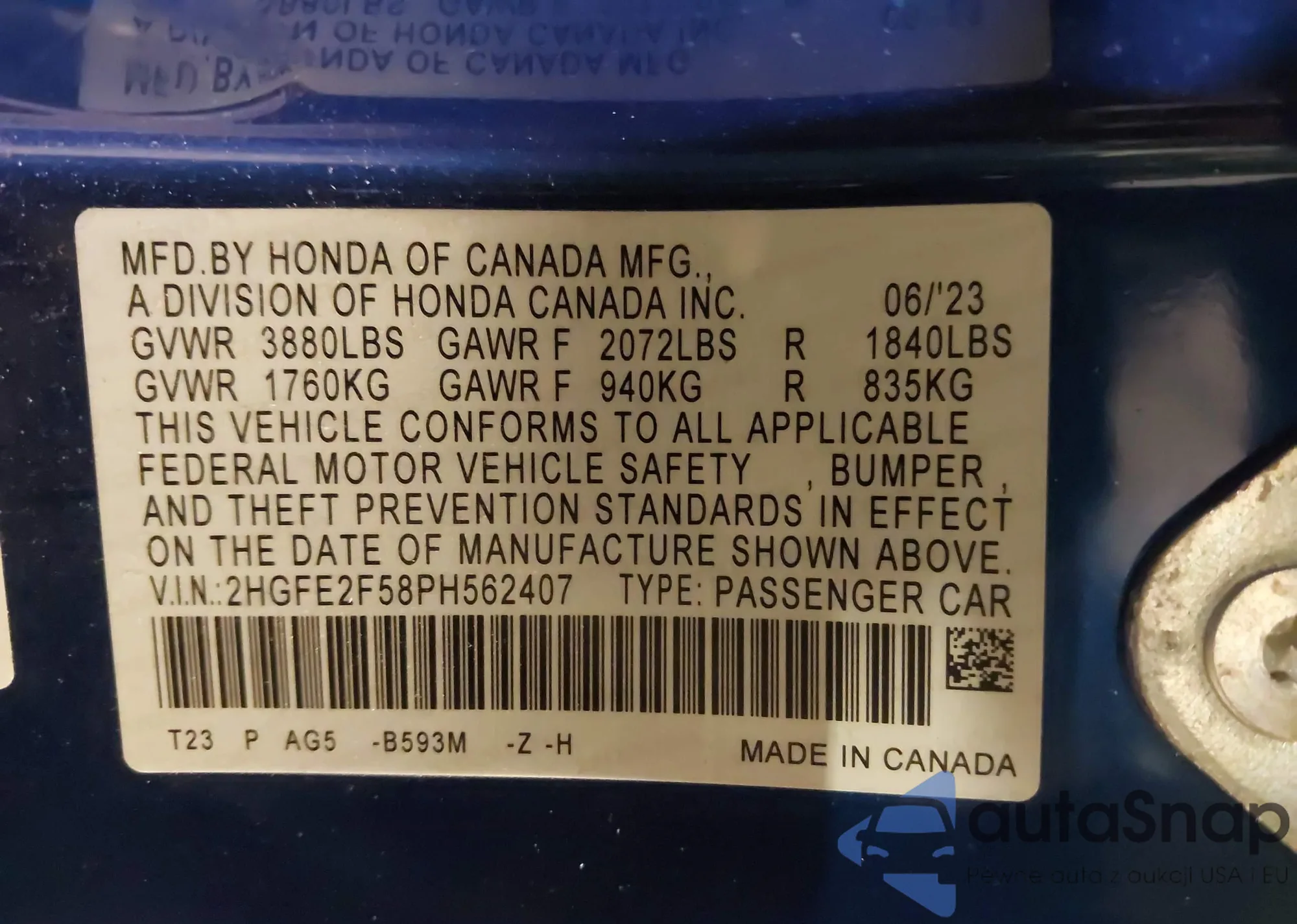 • VIN 2HGFE2F58PH562407