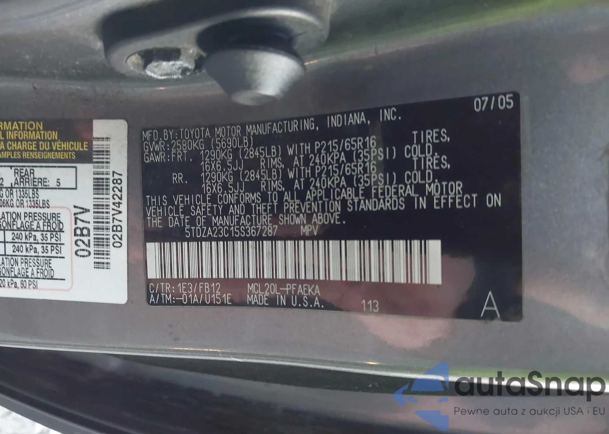 LOT: 43687165 VIN: 5TDZA23C15S367287