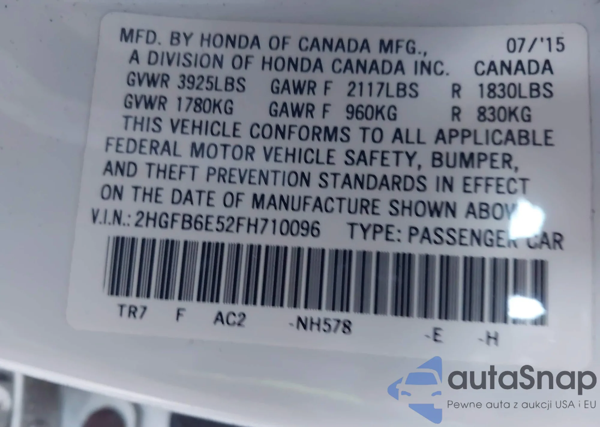LOT: 43945025 VIN: JHMZE2H73AS017661