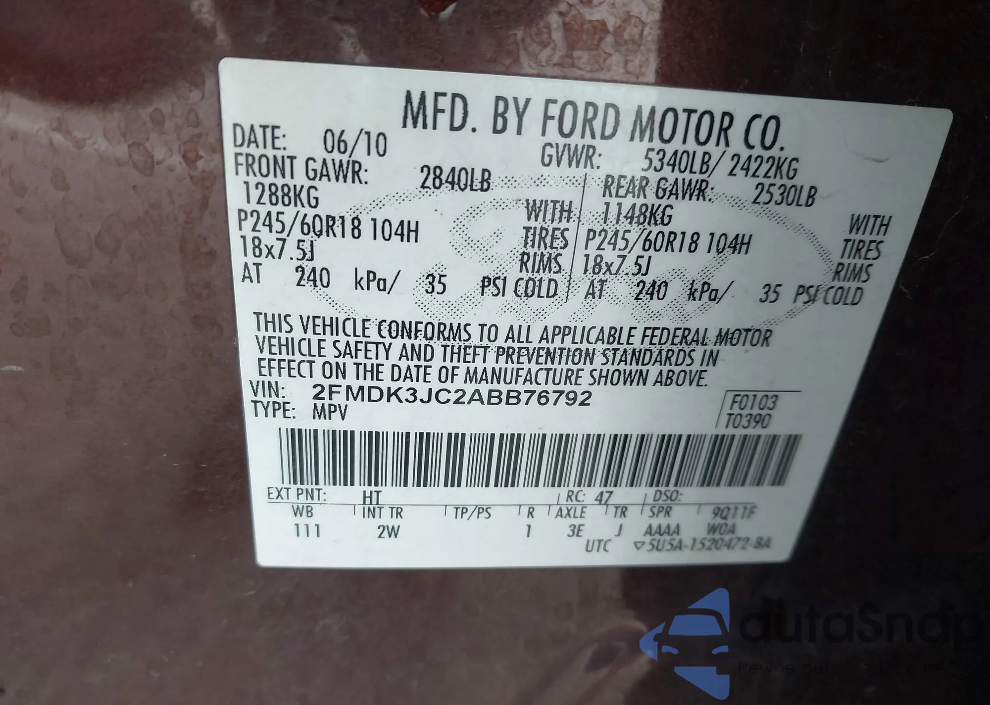 • VIN 2FMDK3JC2ABB76792