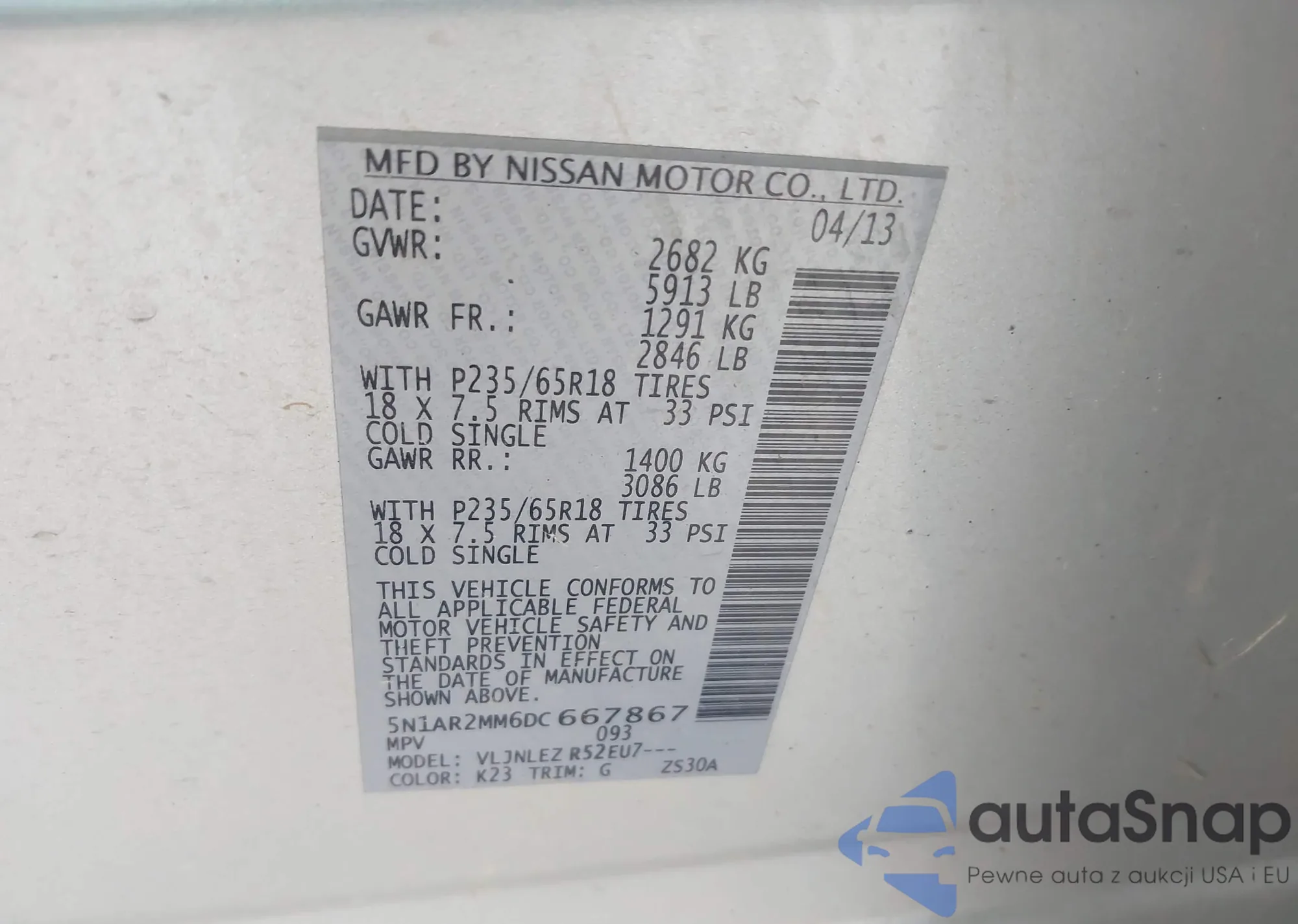 LOT: 43967784 VIN: 5N1AR2MM6DC667867