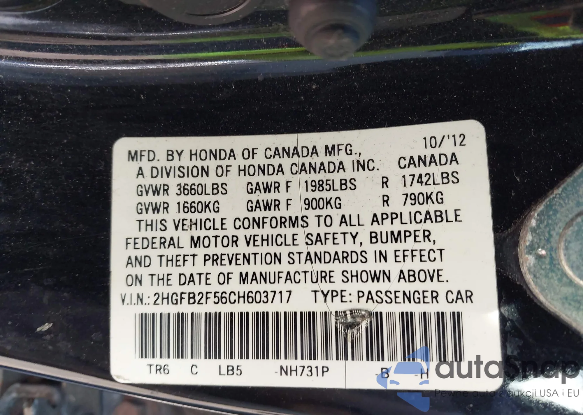 • VIN 2HGFB2F56CH603717