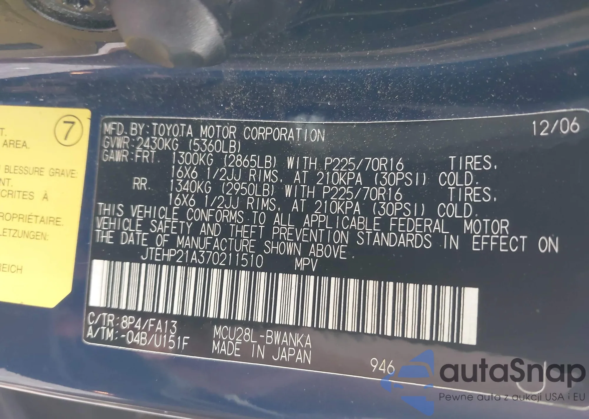 LOT: 43809131 VIN: JTEHP21A370211510