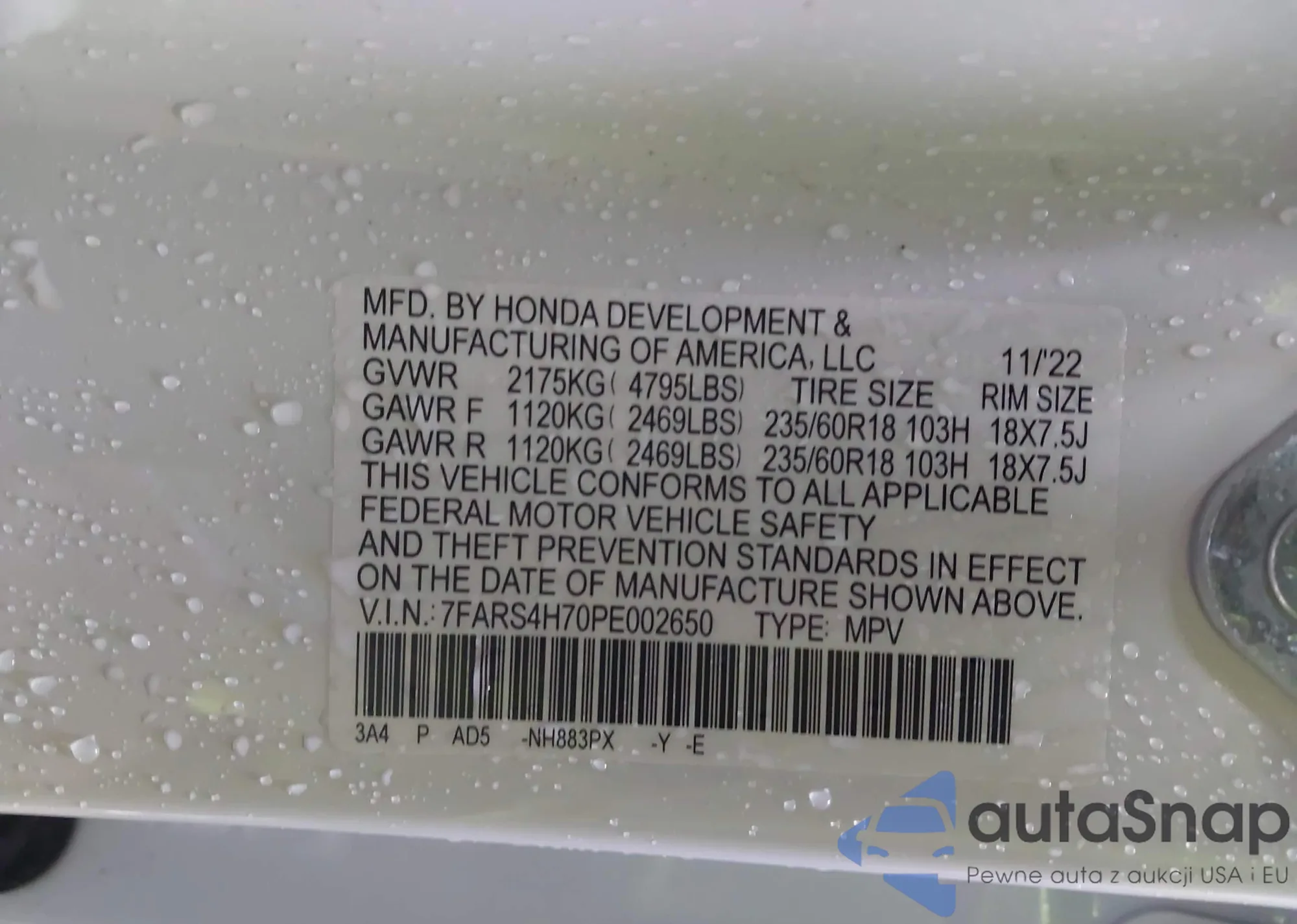 LOT: 43952990 VIN: JHMEG855XSS015454