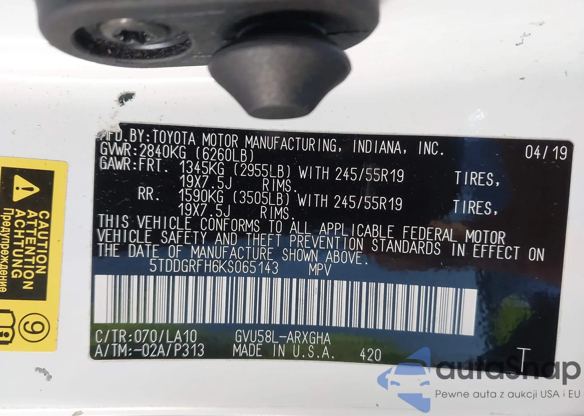 LOT: 43638232 VIN: 5TDDGRFH6KS065143