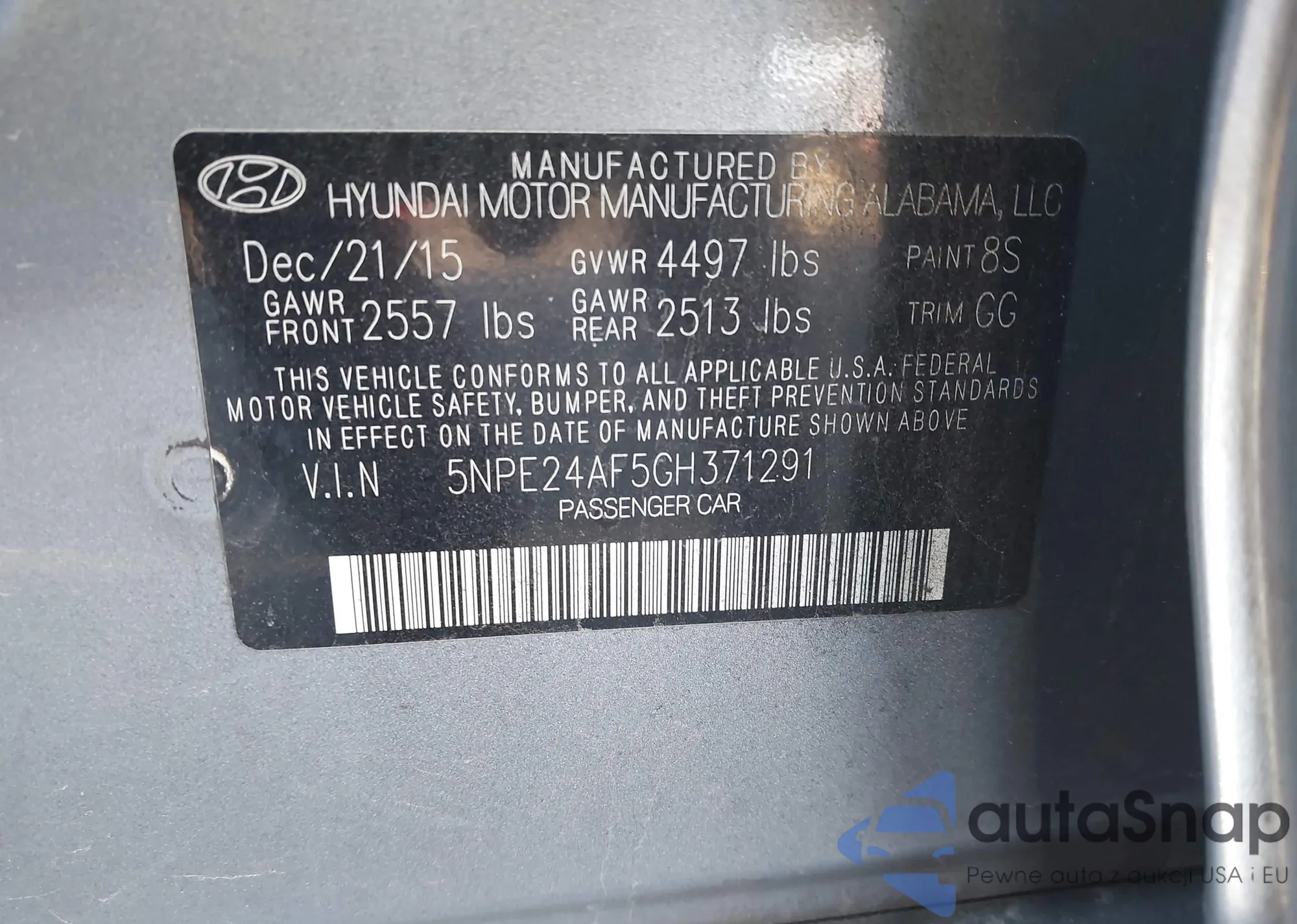 • VIN 5NPE24AF5GH371291