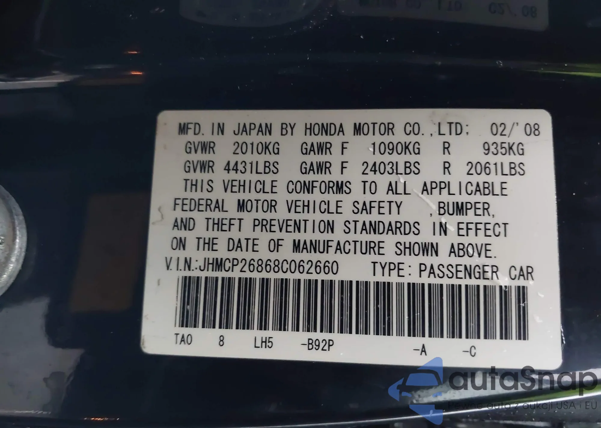 LOT: 43703064 VIN: JHMCP26868C062660
