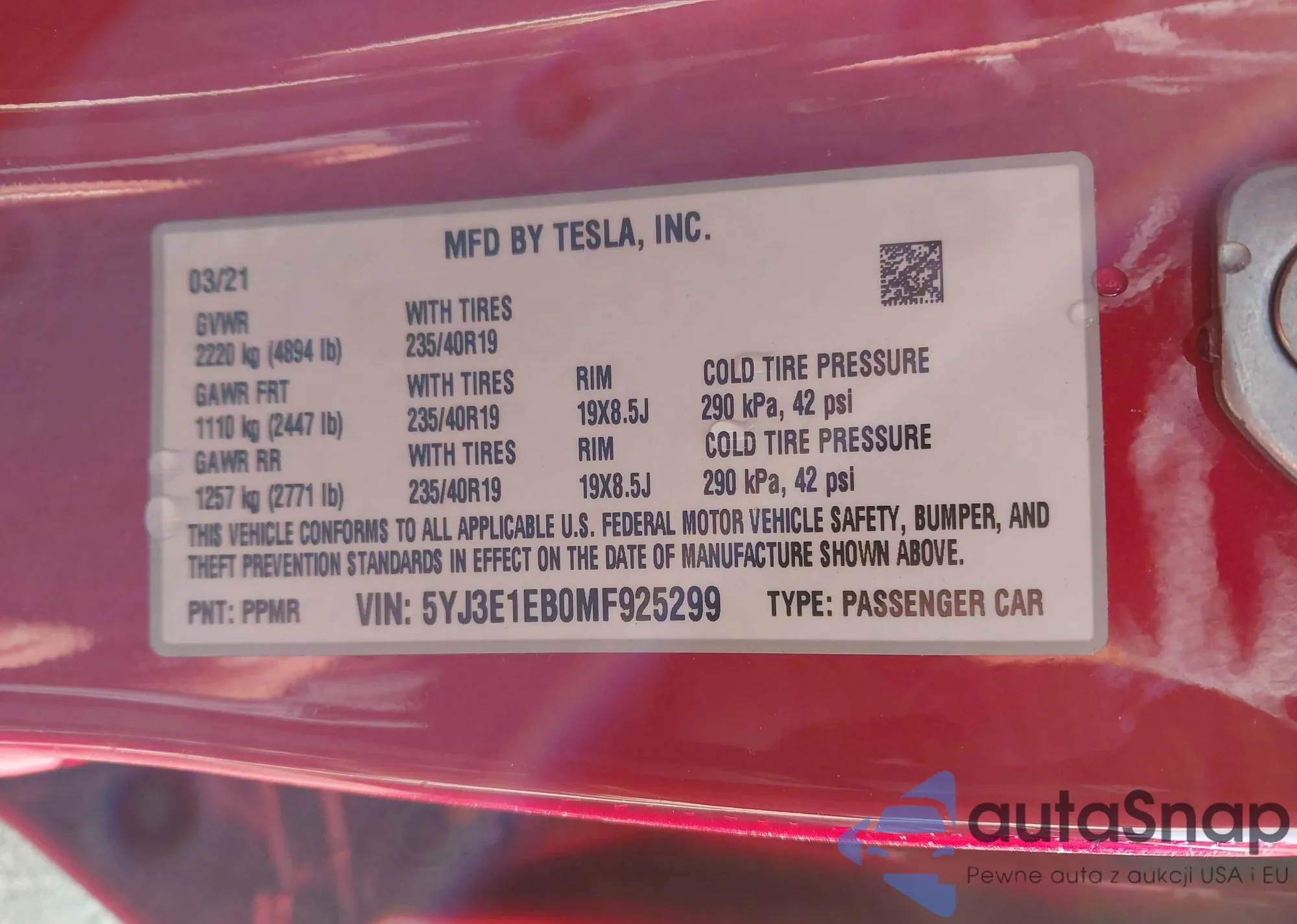 • VIN 5YJ3E1EB0MF925299