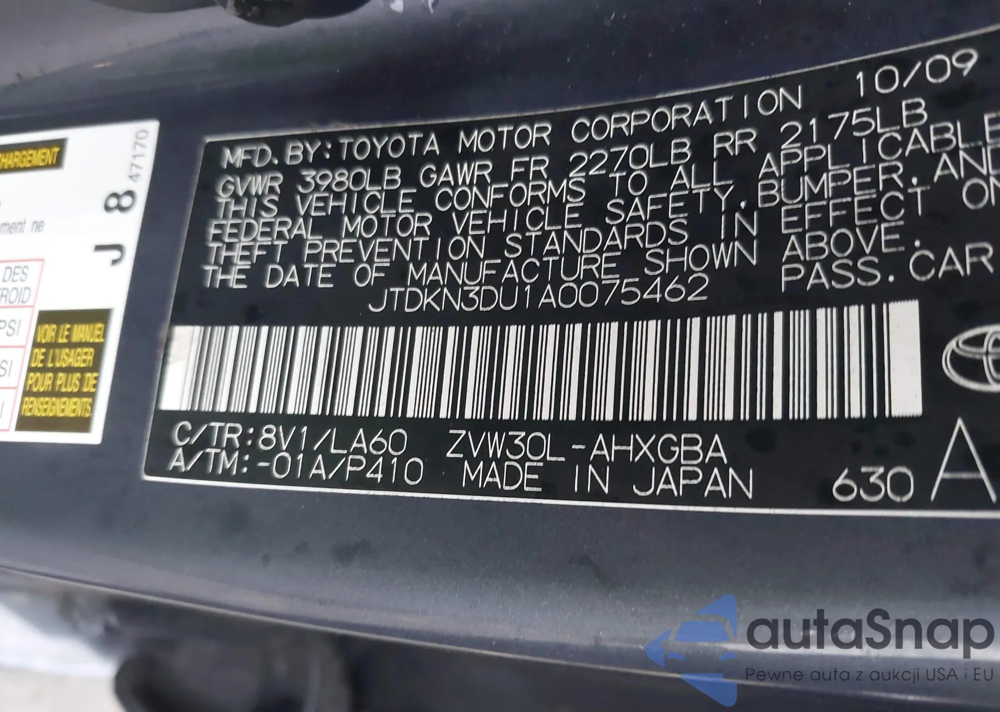 LOT: 44004250 VIN: JTDKN3DU1A0075462