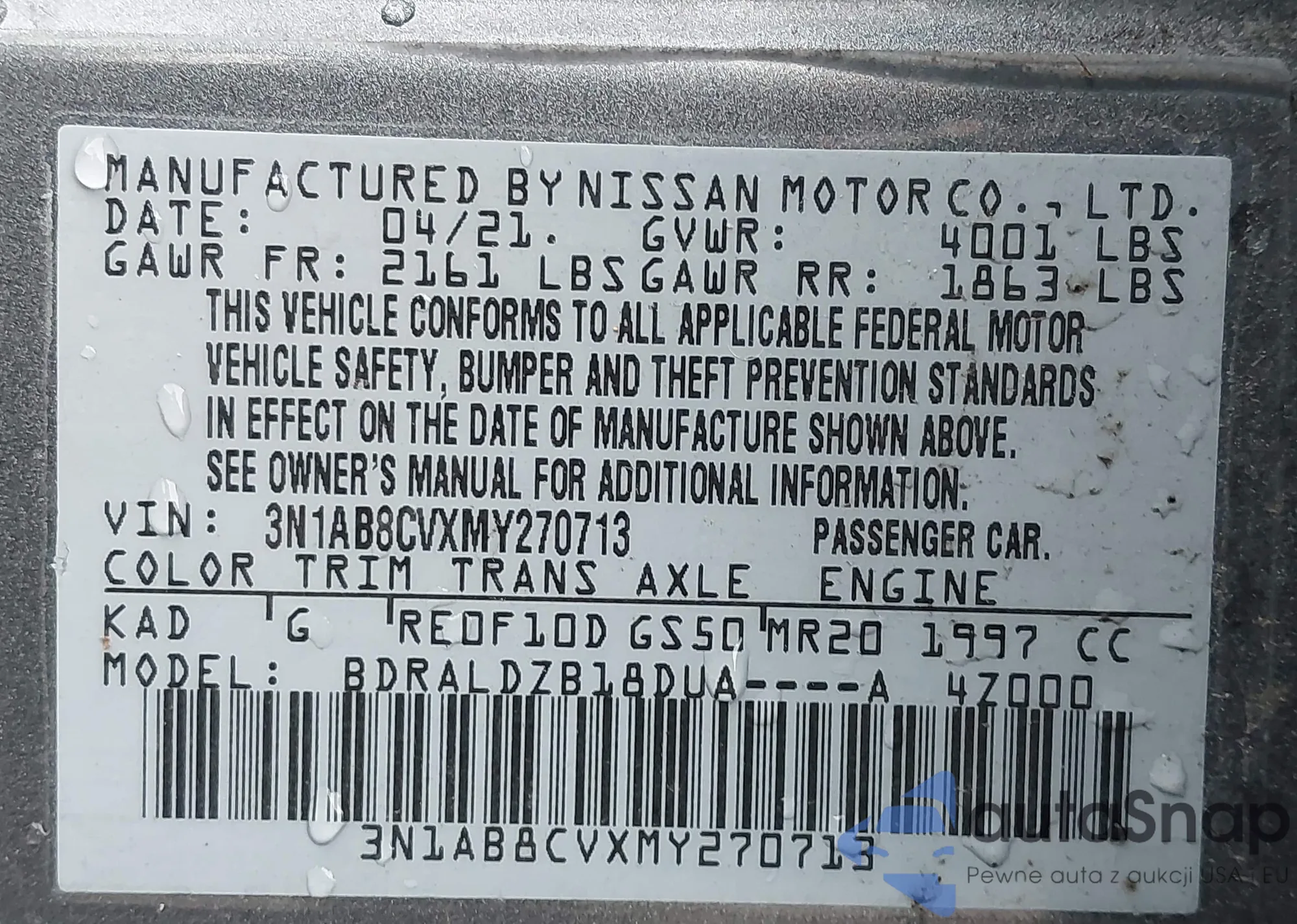 LOT: 43898352 VIN: 3N1AB8CVXMY270713