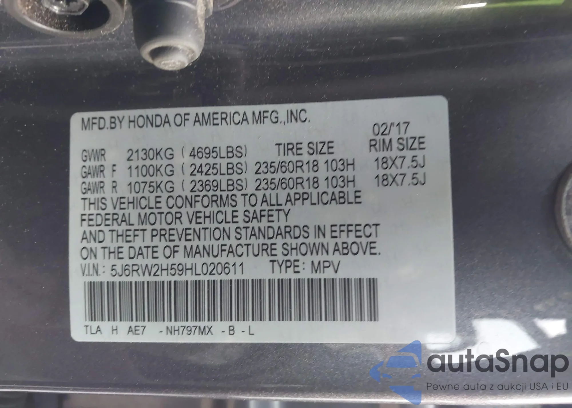 • VIN 5J6RW2H59HL020611