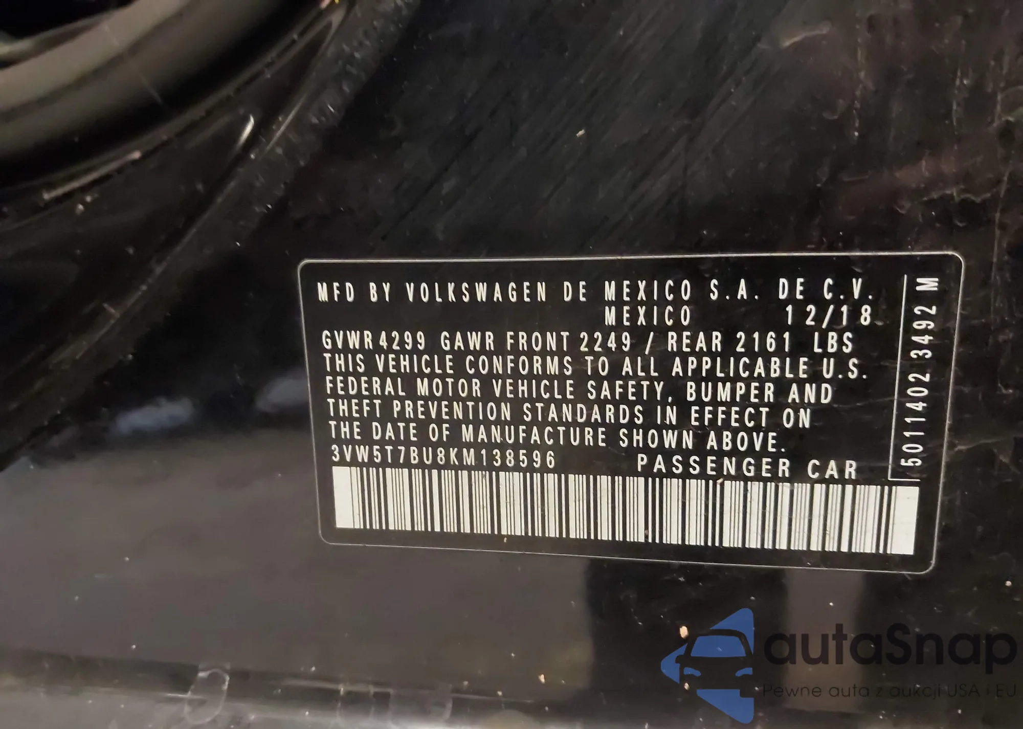• VIN 3VW5T7BU8KM138596