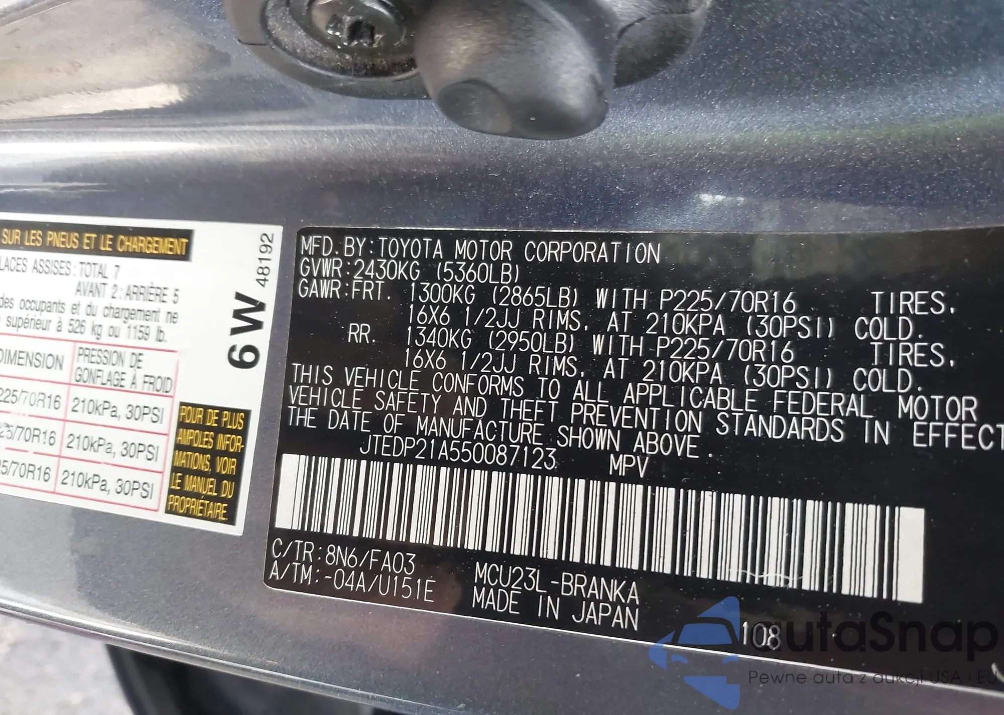 LOT: 44097448 VIN: JTEDP21A550087123