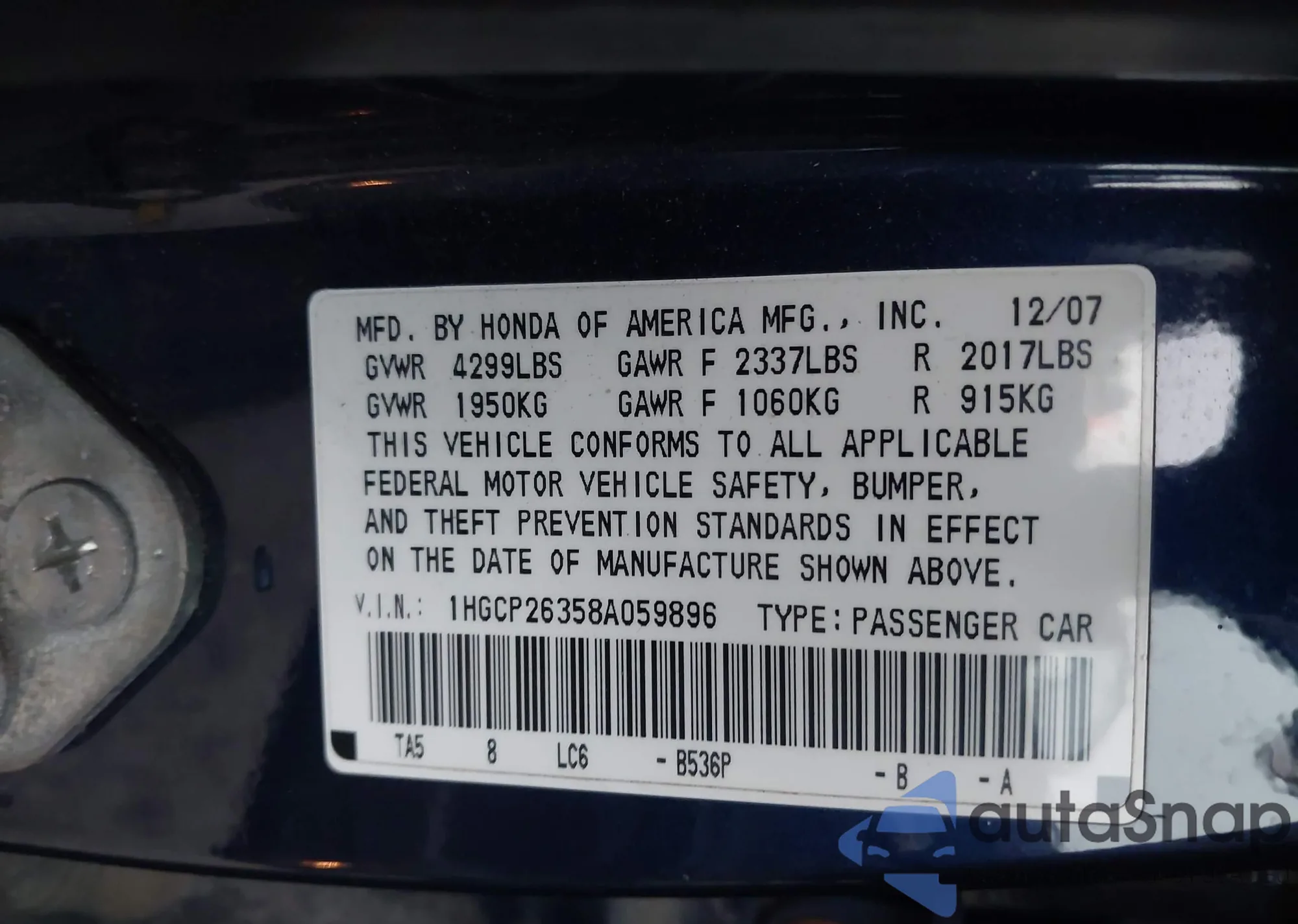 LOT: 43978426 VIN: 1HGCP26358A059896
