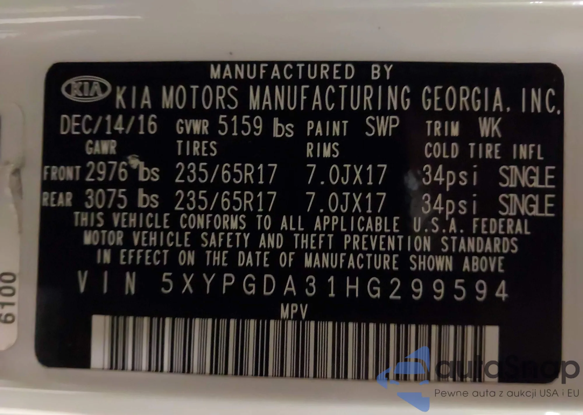 LOT: 44009574 VIN: 5XYPGDA31HG299594