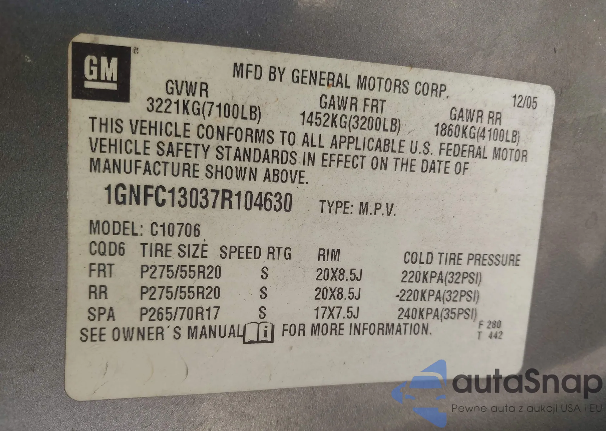 LOT: 44177147 VIN: 1GNFC13037R104630