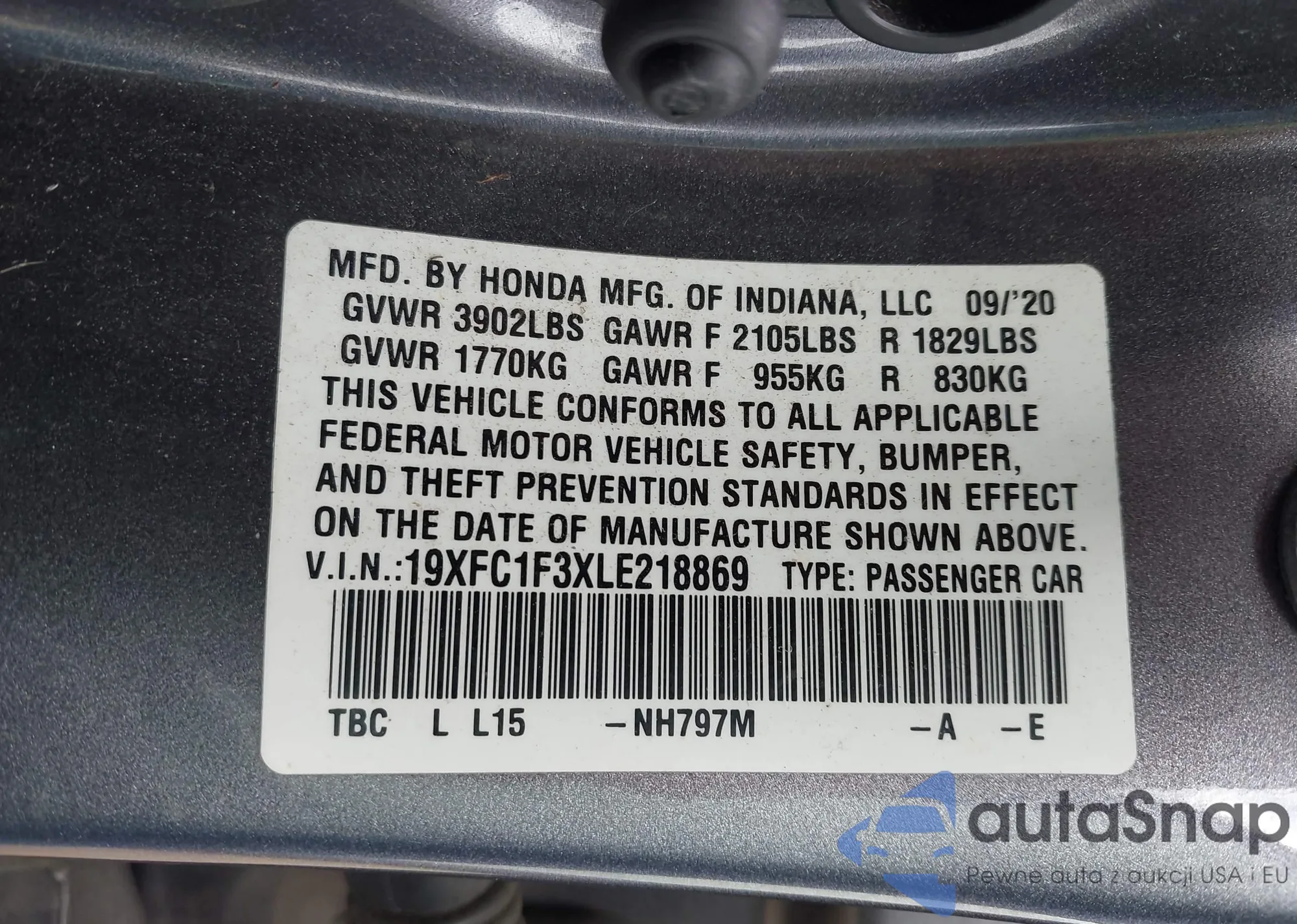 • VIN 19XFC1F3XLE218869