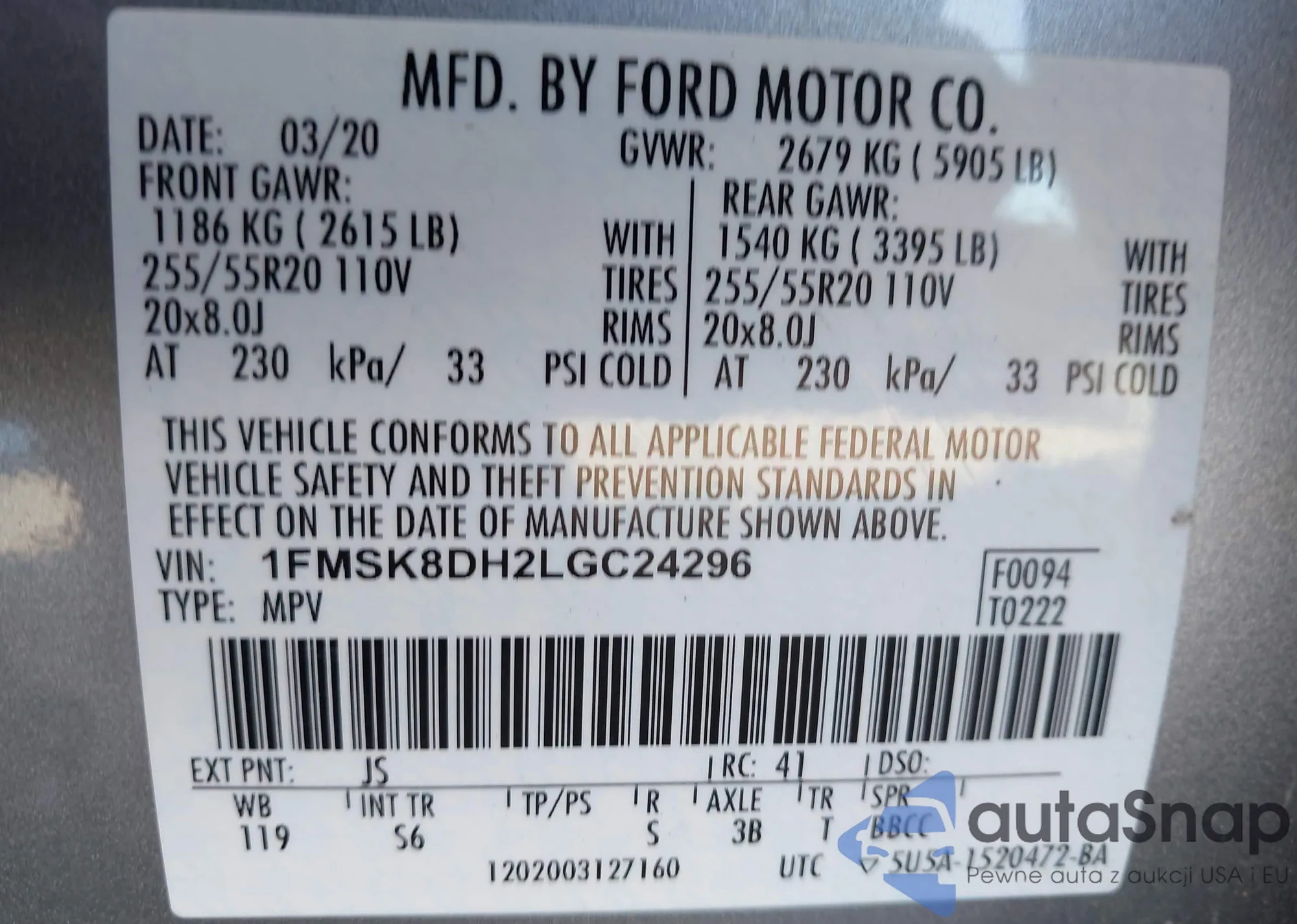 • VIN 1FMSK8DH2LGC24296