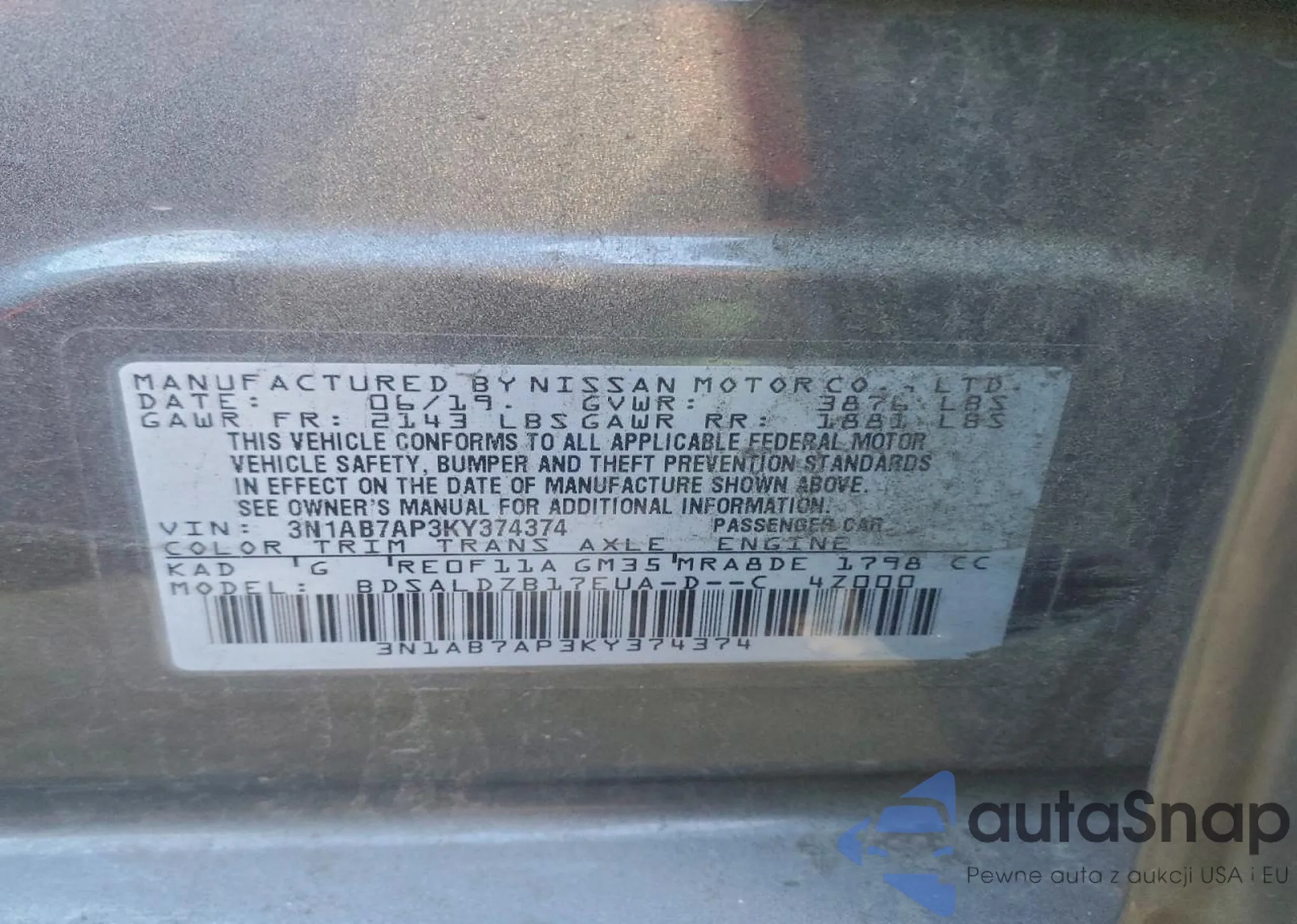 • VIN 3N1AB7AP3KY374374