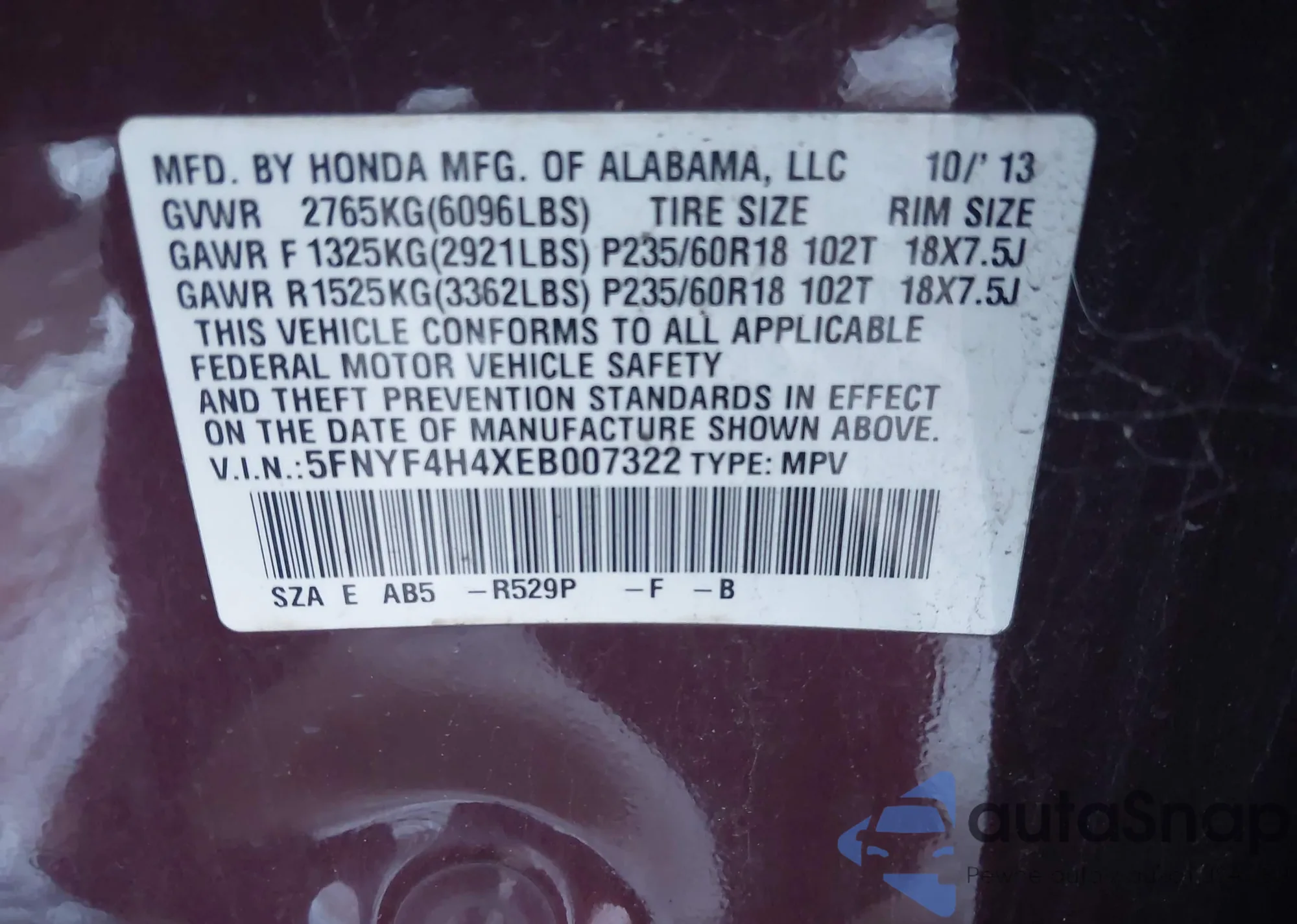 • VIN 5FNYF4H4XEB007322