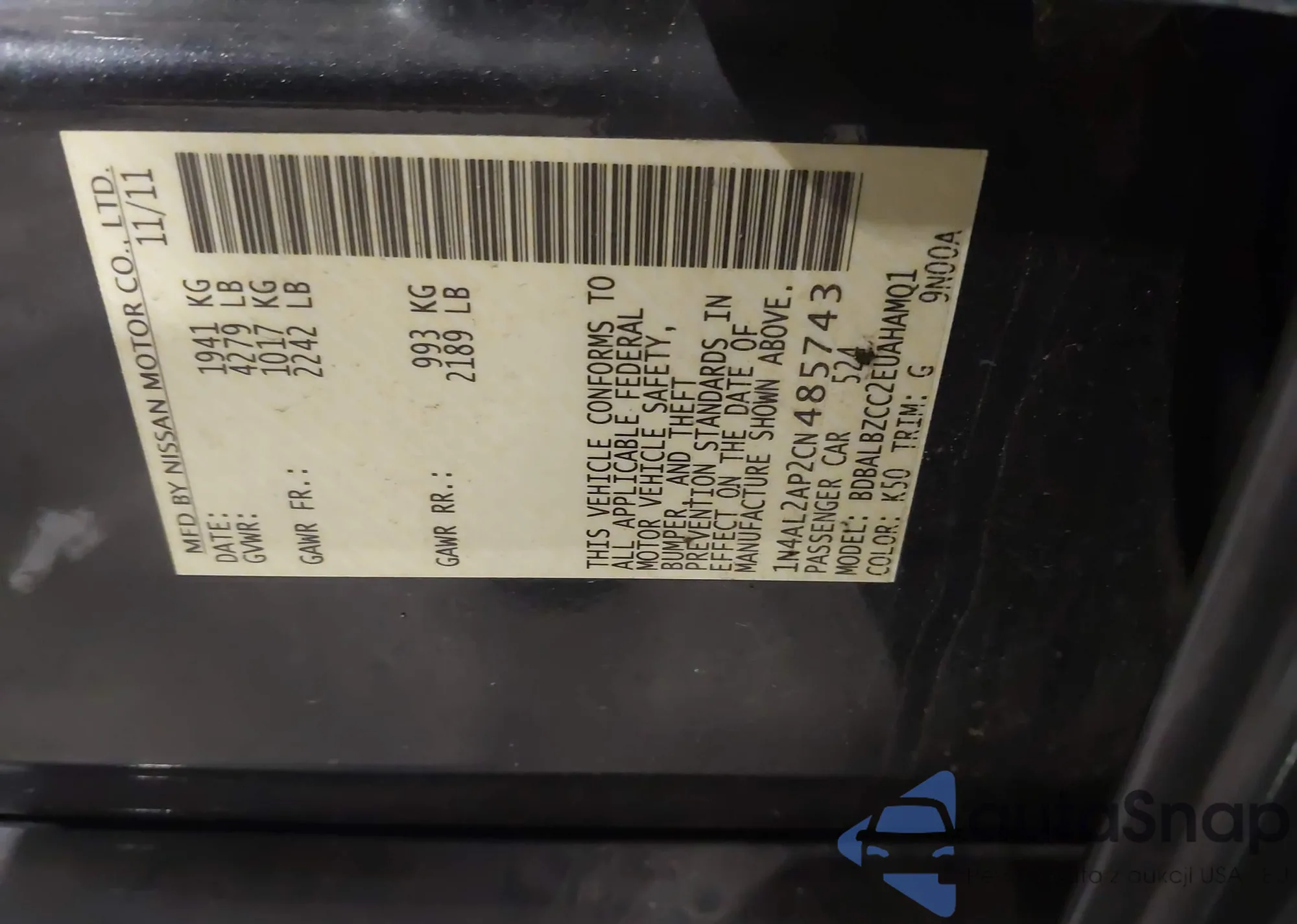 LOT: 44089396 VIN: 5N1AZ2MH1HN102892