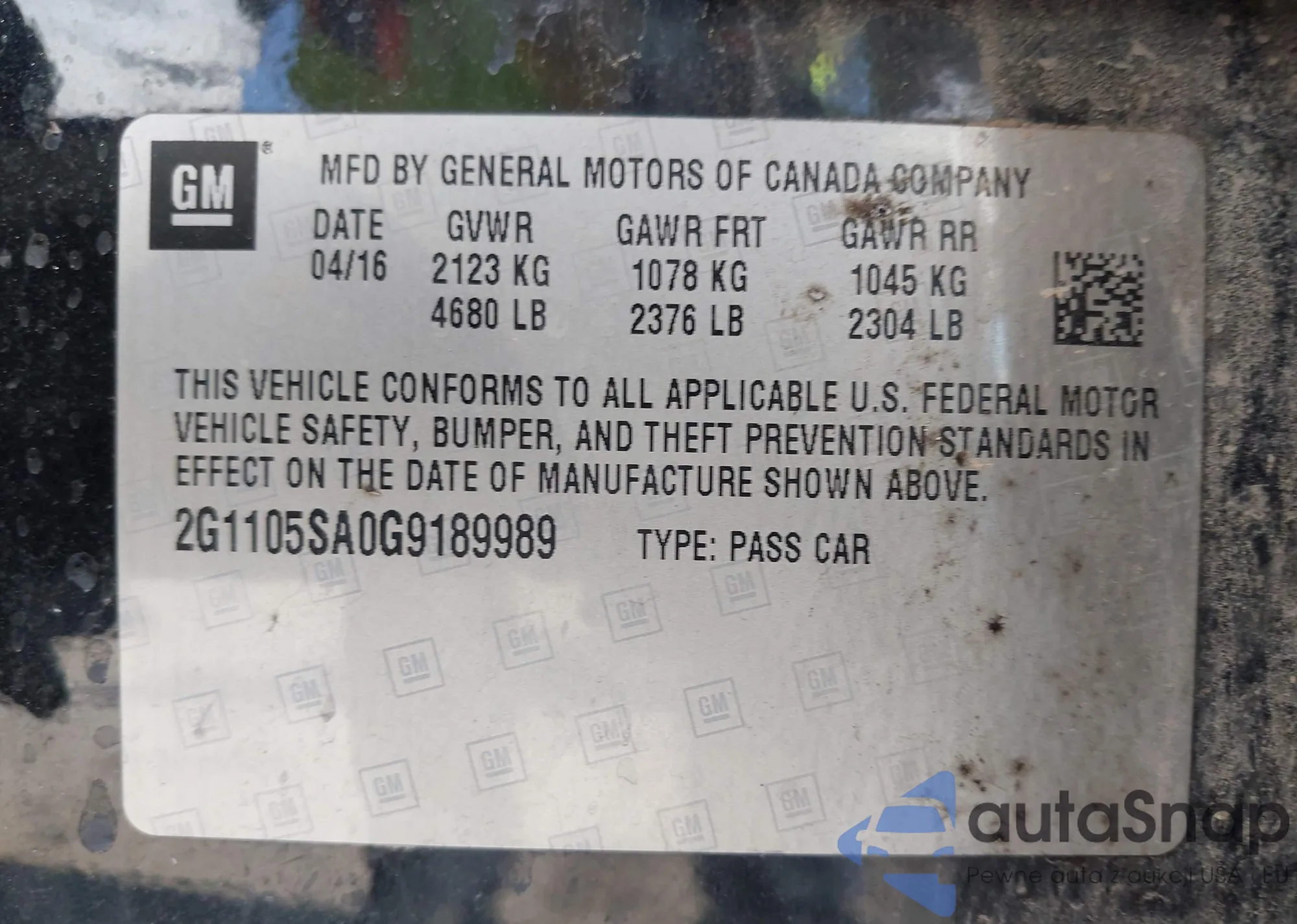 LOT: 43637734 VIN: 2G1105SA0G9189989