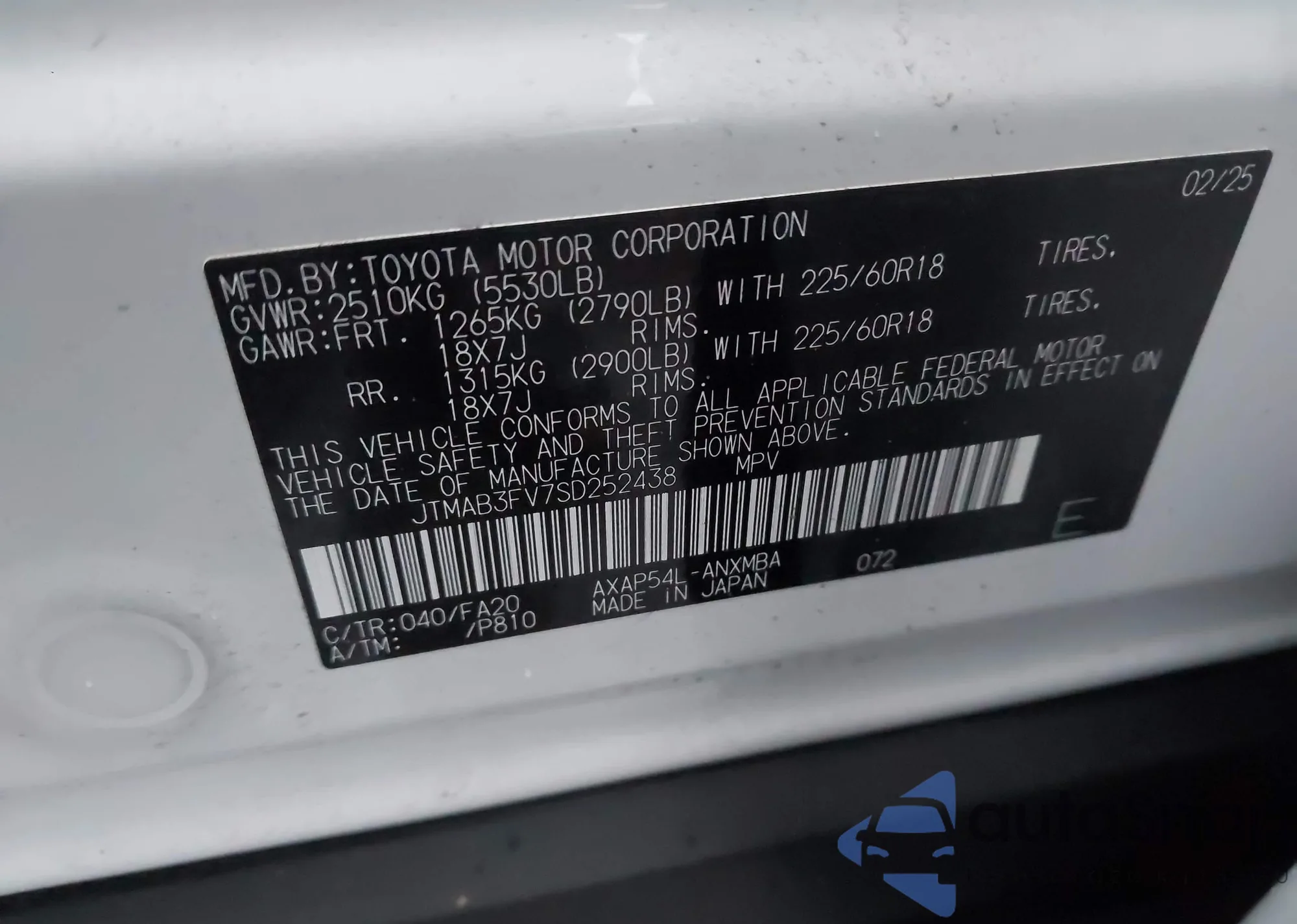 LOT: 43856917 VIN: JTMAB3FV7SD252438