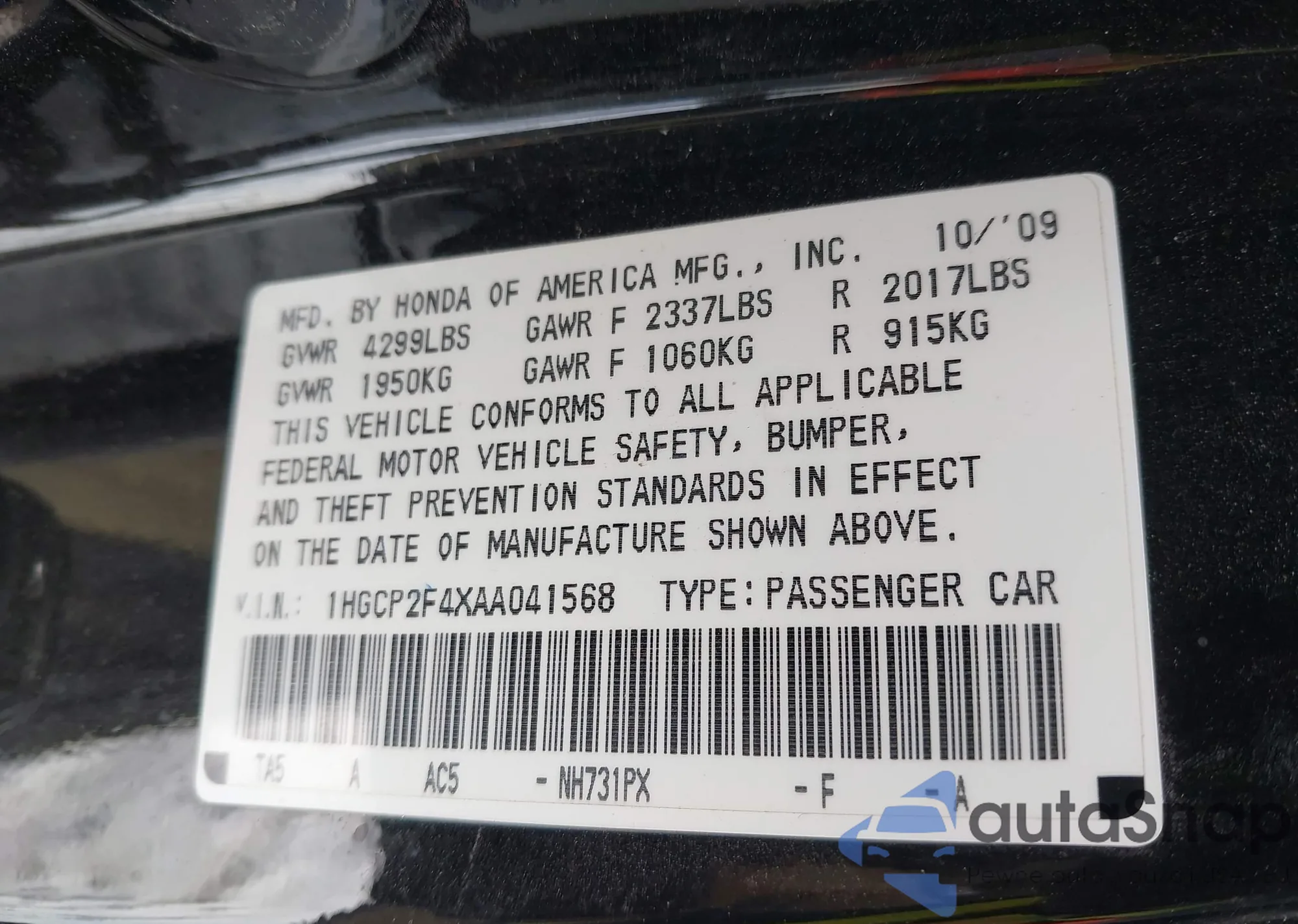 • VIN 1HGCP2F4XAA041568