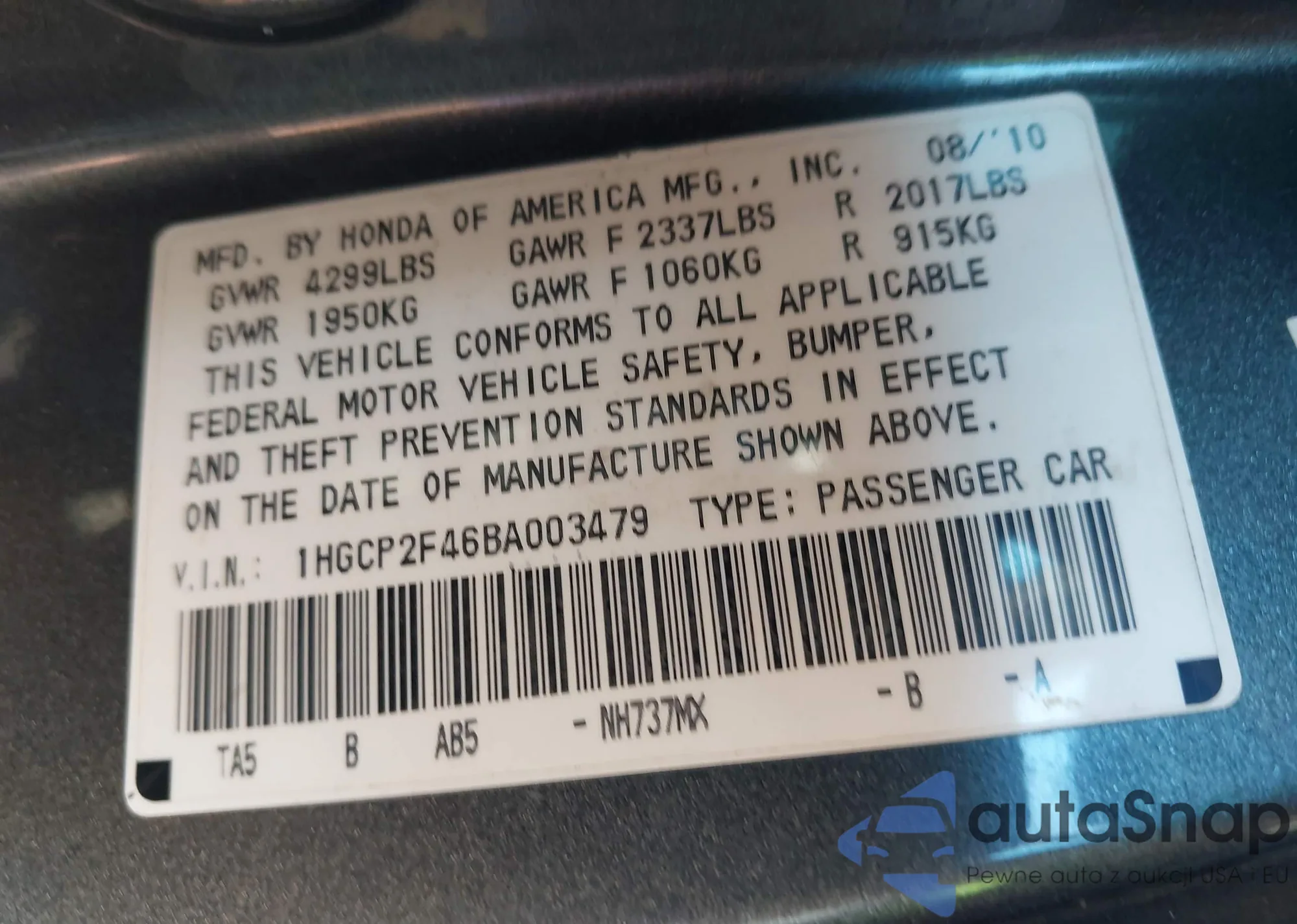LOT: 43914872 VIN: 1HGCP2F4XAA041568