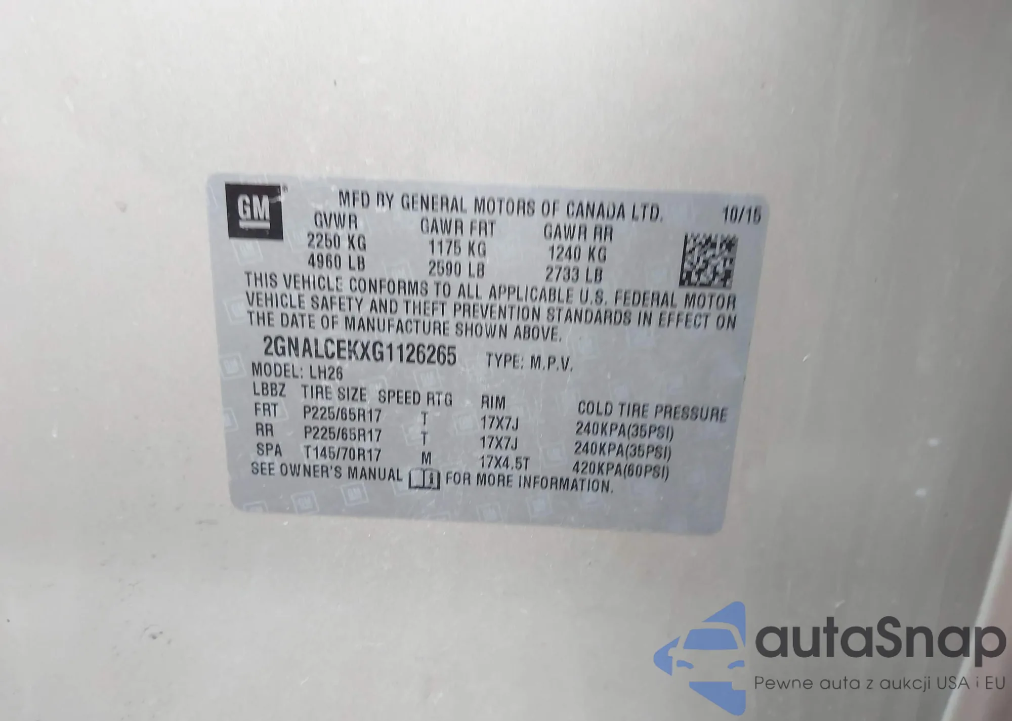 LOT: 44074774 VIN: 2GNALCEKXG1126265
