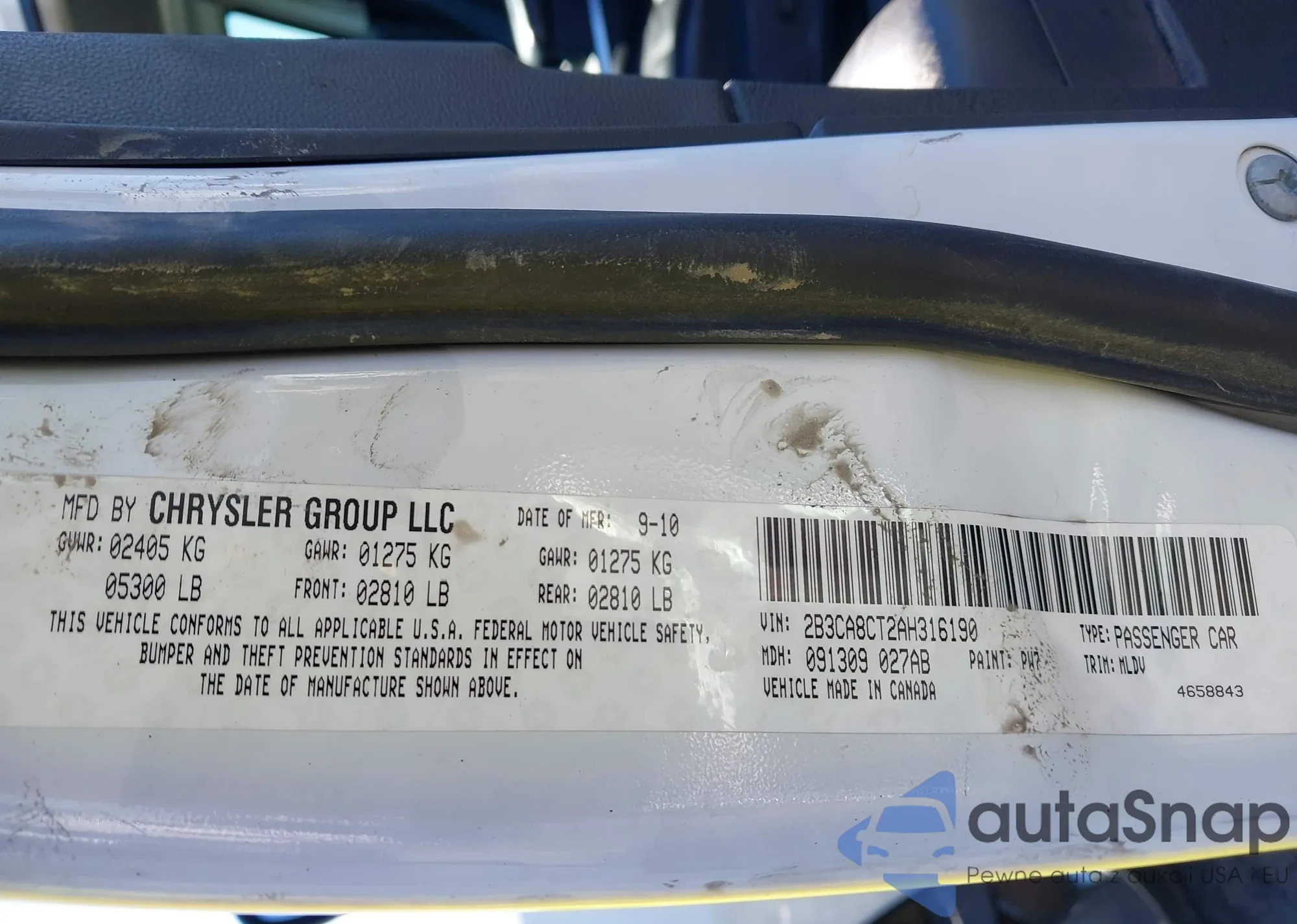 LOT: 43966042 VIN: 2B3CA8CT2AH316190