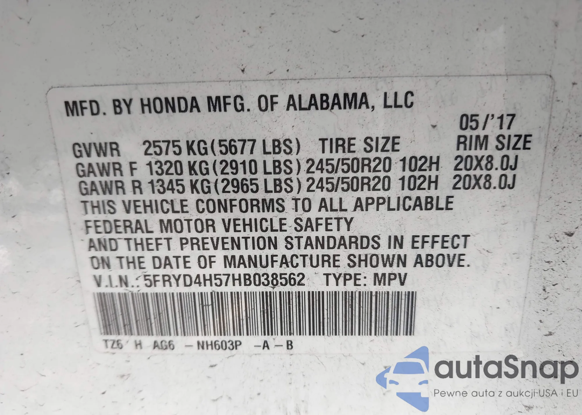 • VIN 5FRYD4H57HB038562