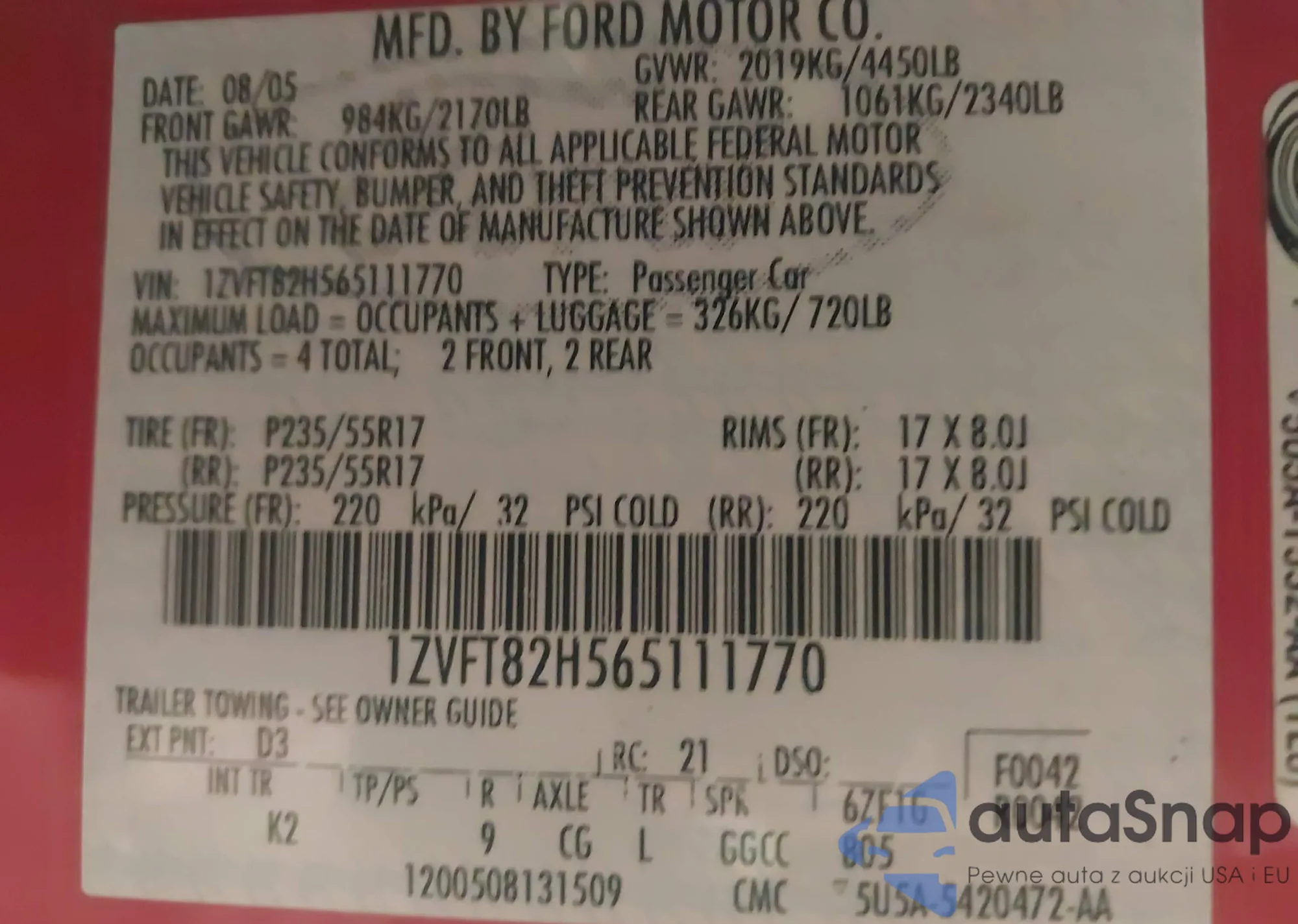 • VIN 1ZVFT82H565111770