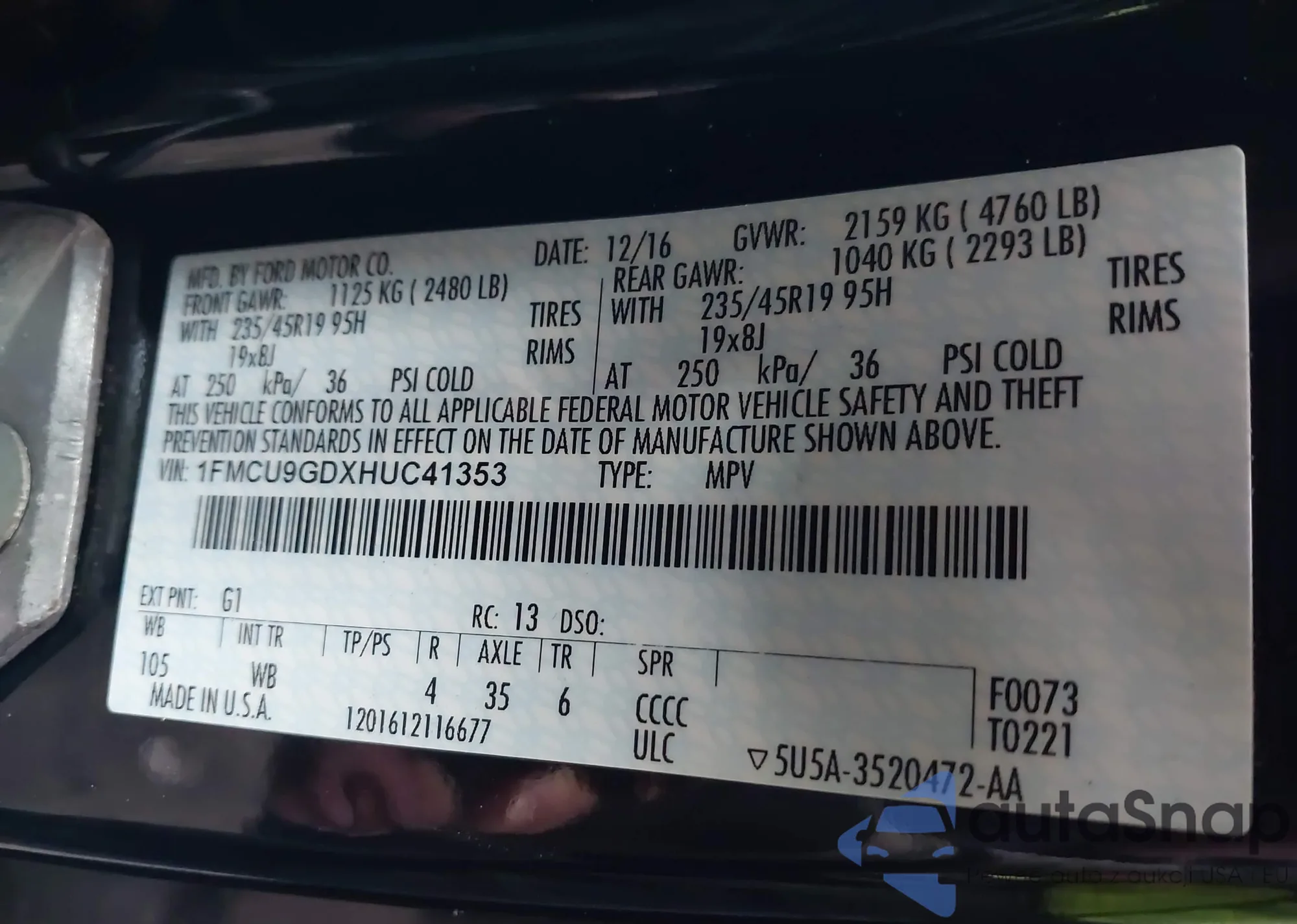 LOT: 44018497 VIN: 1FMCU9GDXHUC41353