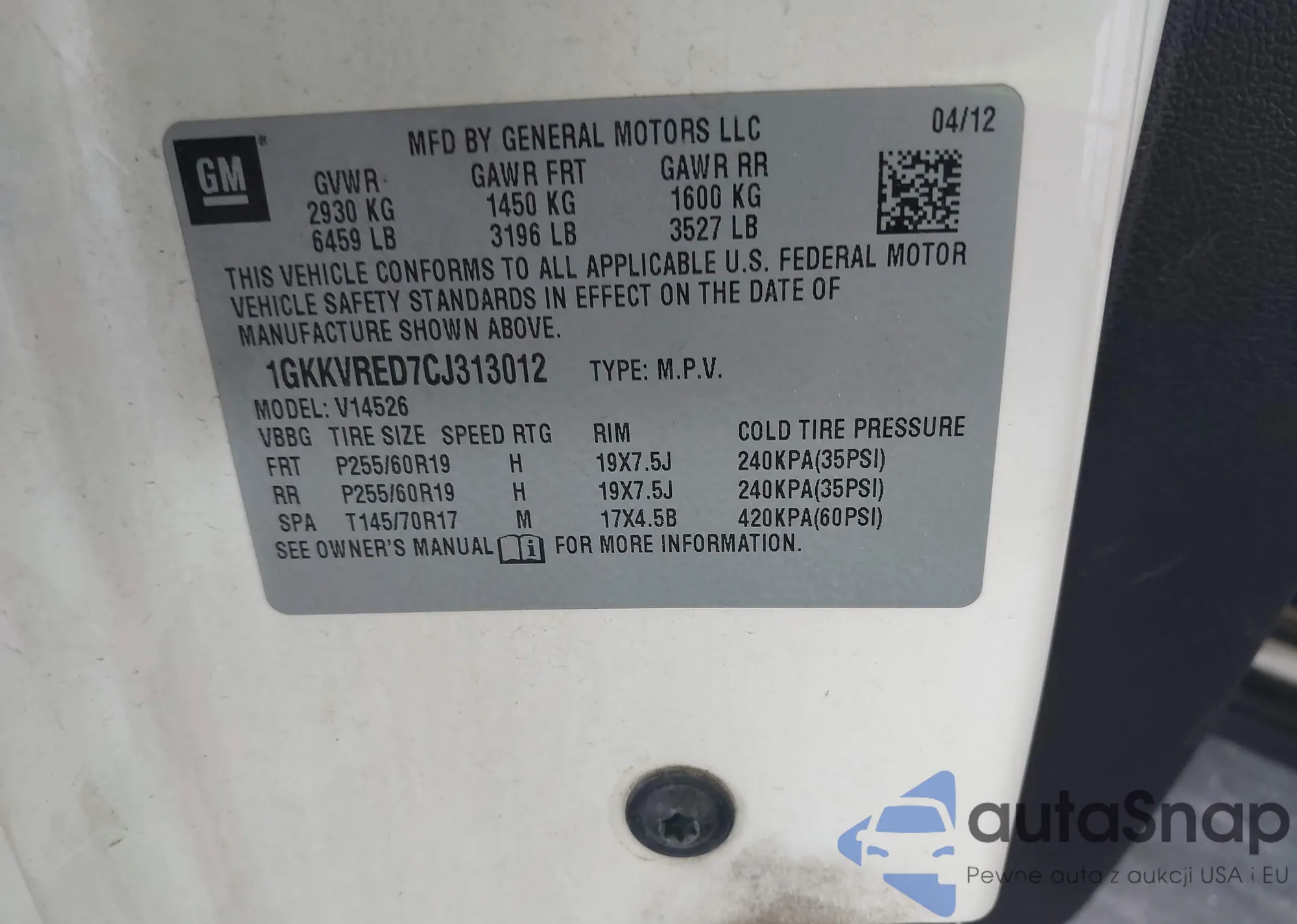 LOT: 39989533 VIN: 1GKKVRED7CJ313012