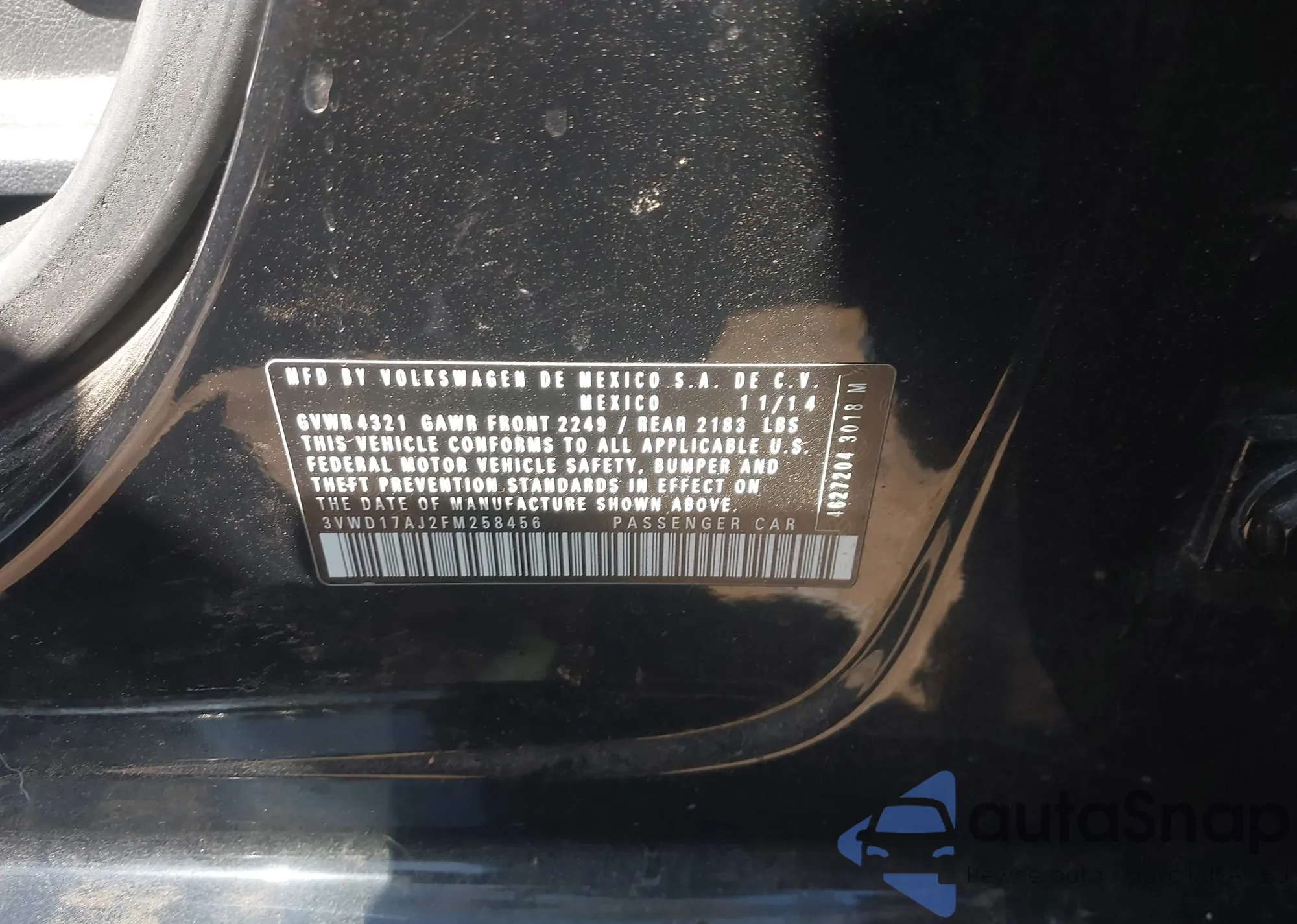 • VIN 3VWD17AJ2FM258456
