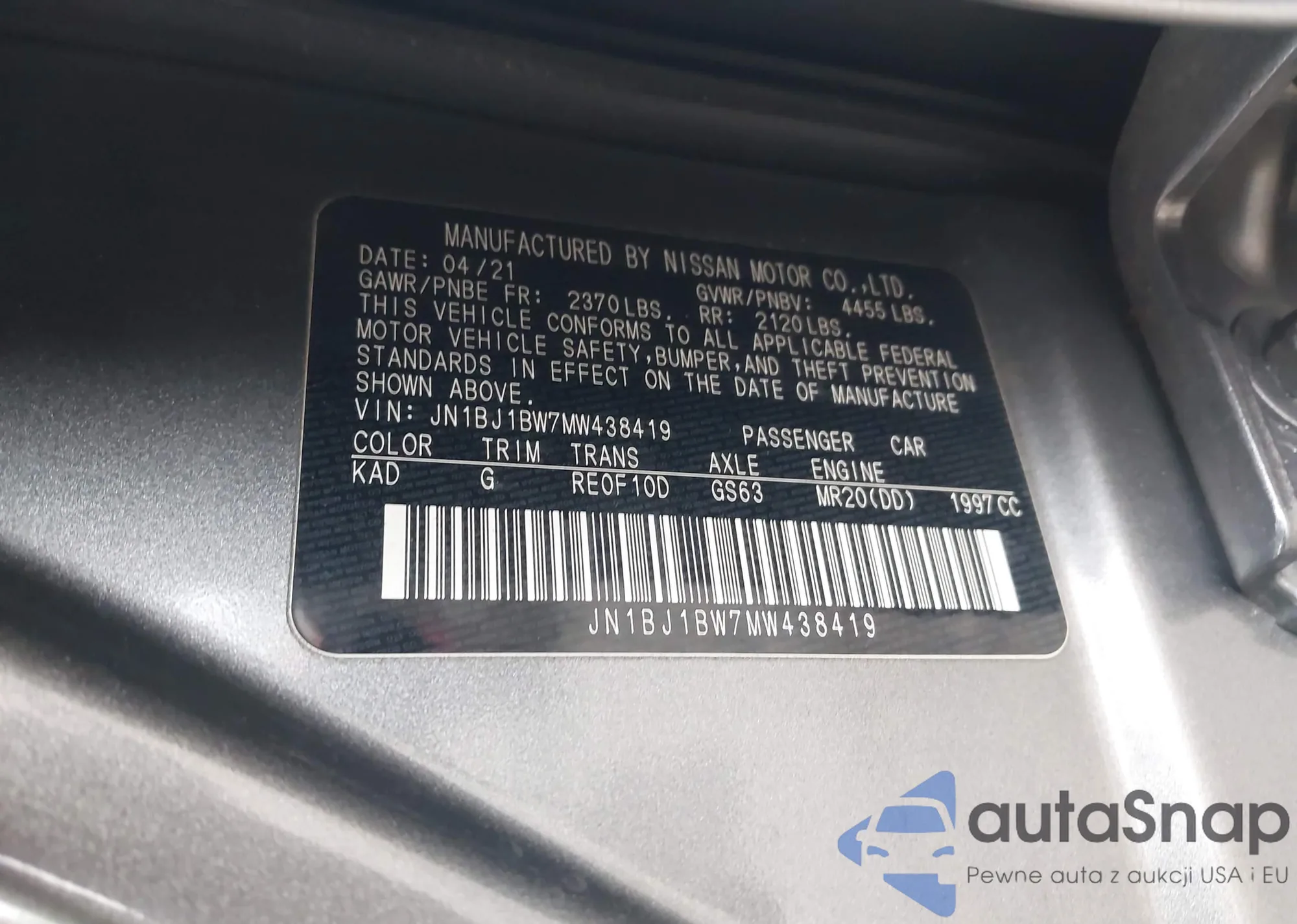 LOT: 43906978 VIN: JN1BJ1BW7MW438419