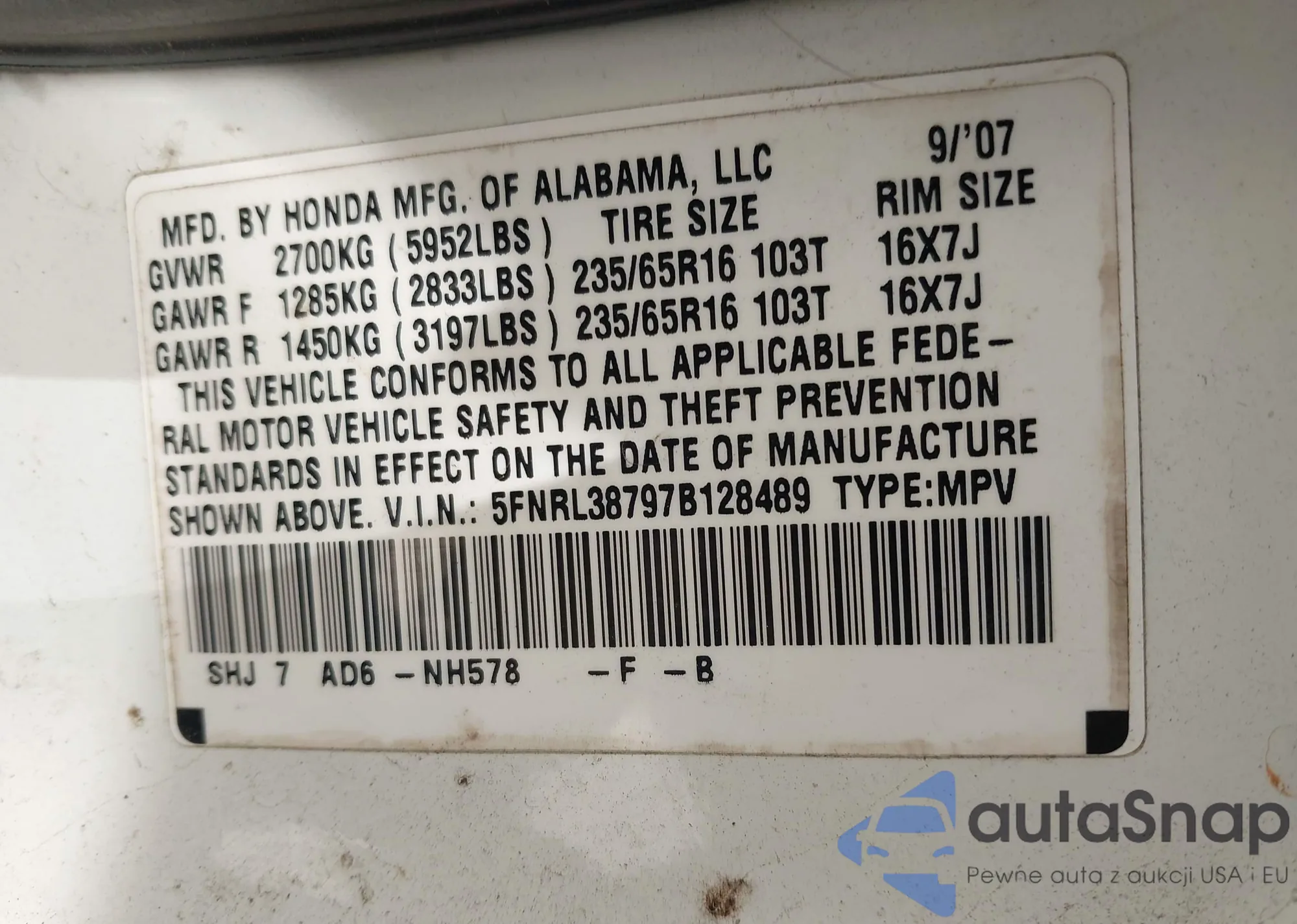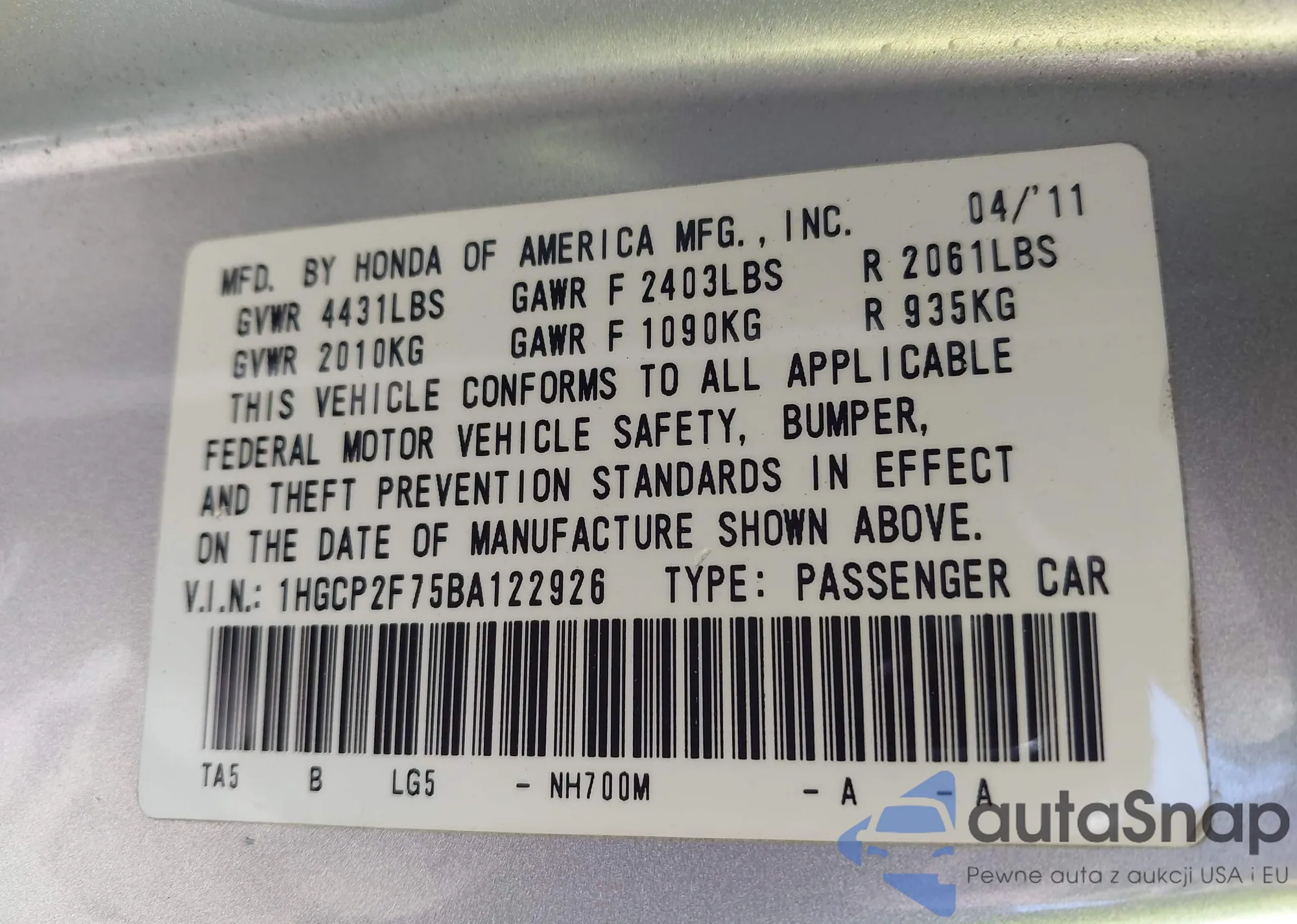 LOT: 44064291 VIN: 1HGCP2F75BA122926