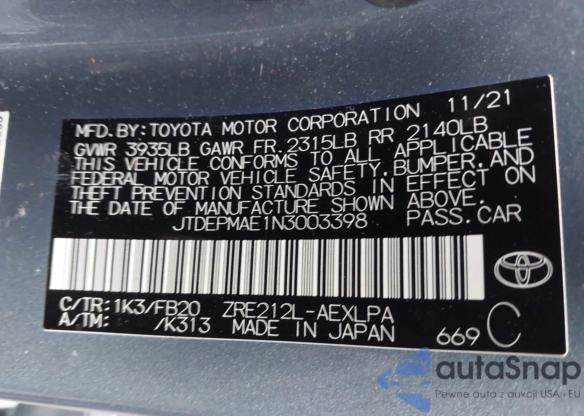LOT: 43766187 VIN: JTDEPMAE1N3003398