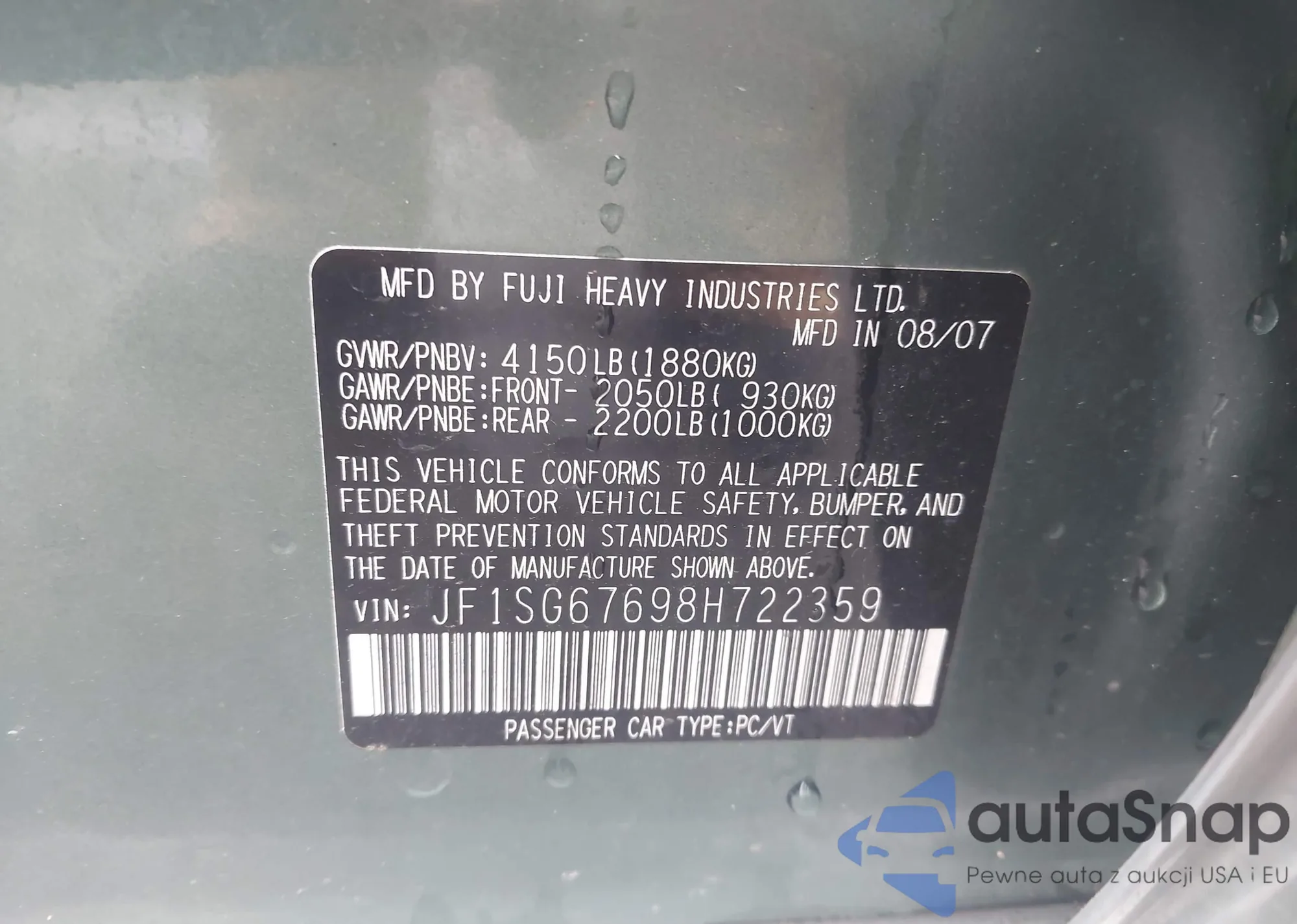 • VIN JF1SG67698H722359
