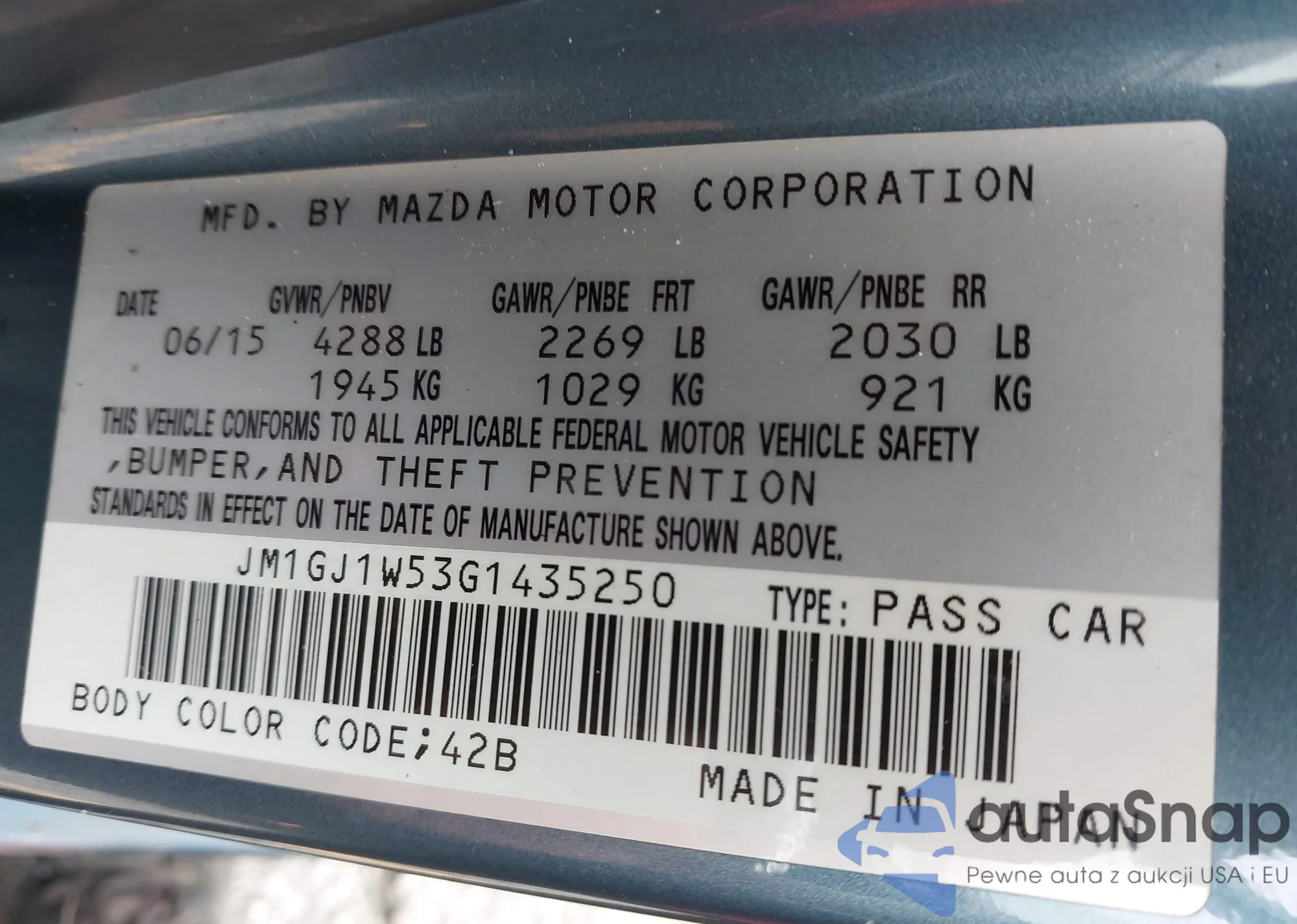 LOT: 43583570 VIN: JM1GJ1W53G1435250