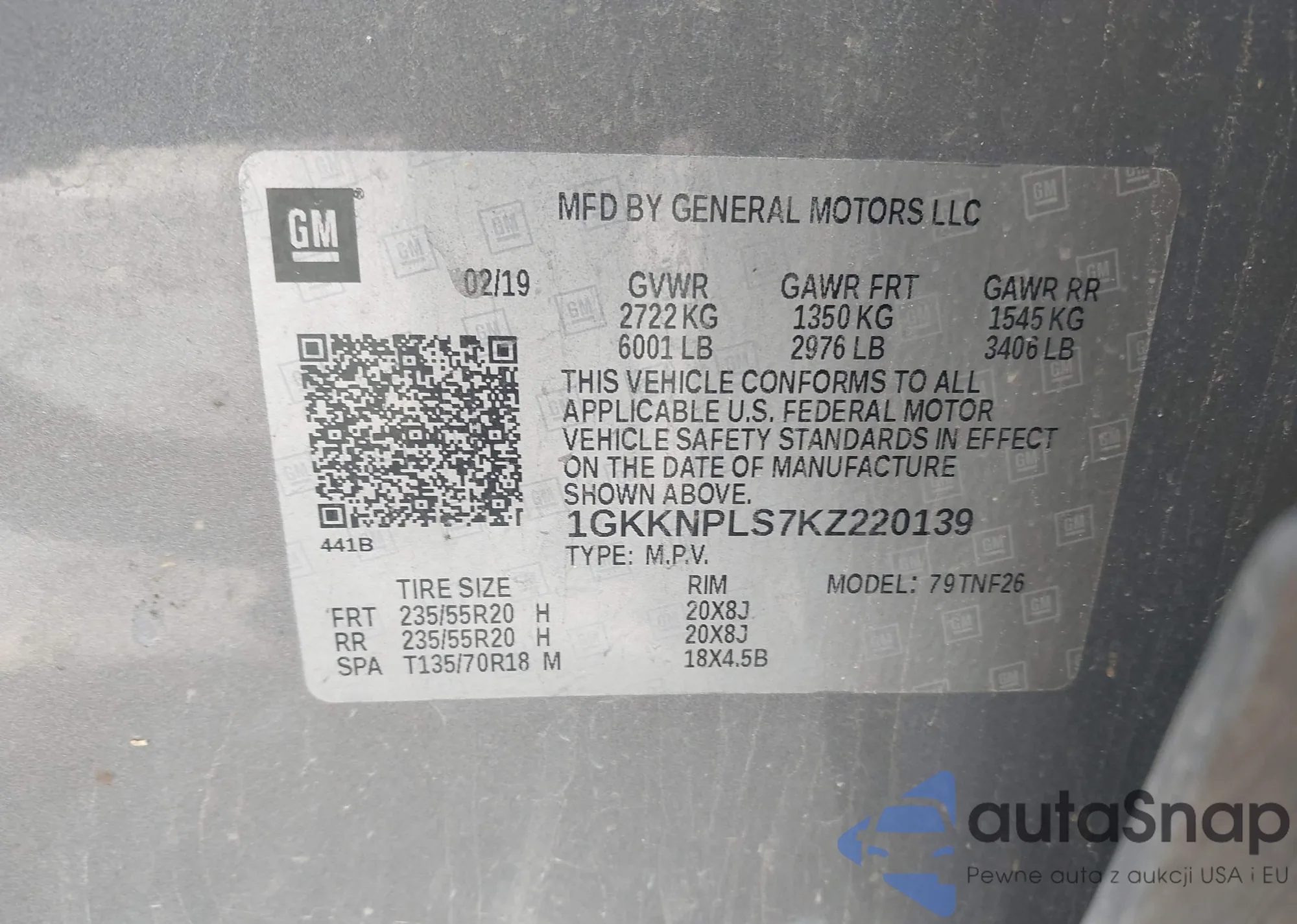 LOT: 43892390 VIN: 1GKKNPLS7KZ220139