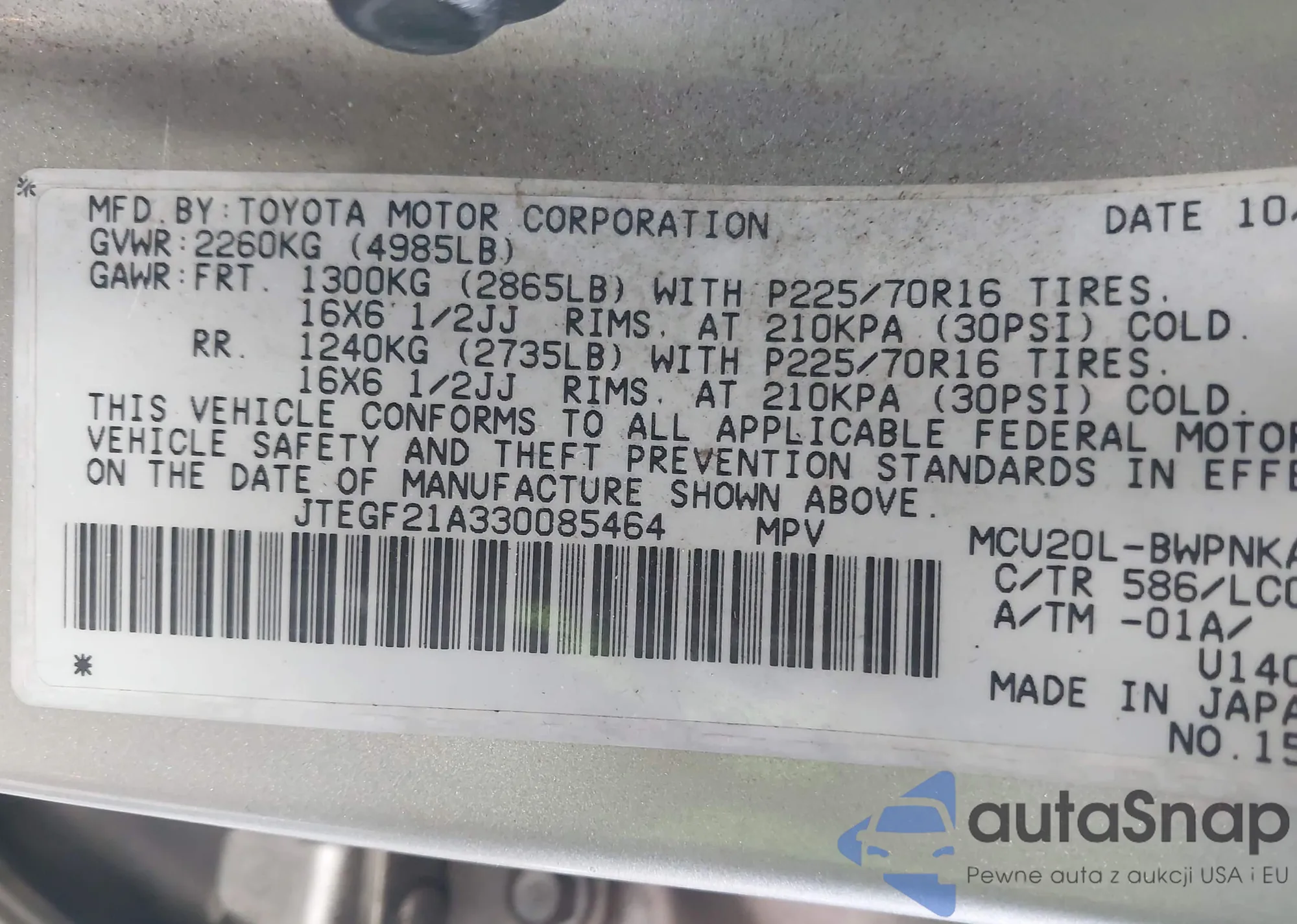 LOT: 44044545 VIN: JTEGF21A330085464