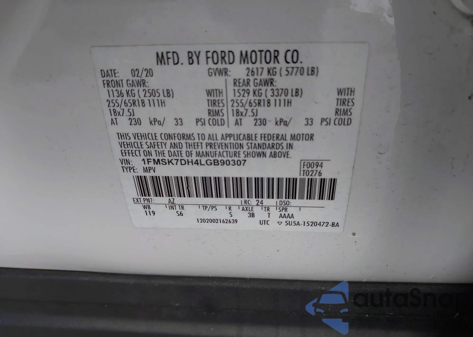 LOT: 43895831 VIN: 1FMSK7DH4LGB90307