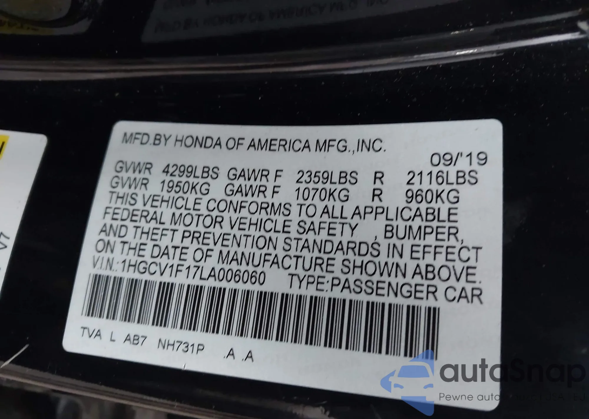 LOT: 42279628 VIN: 1HGCP2F39CA145690